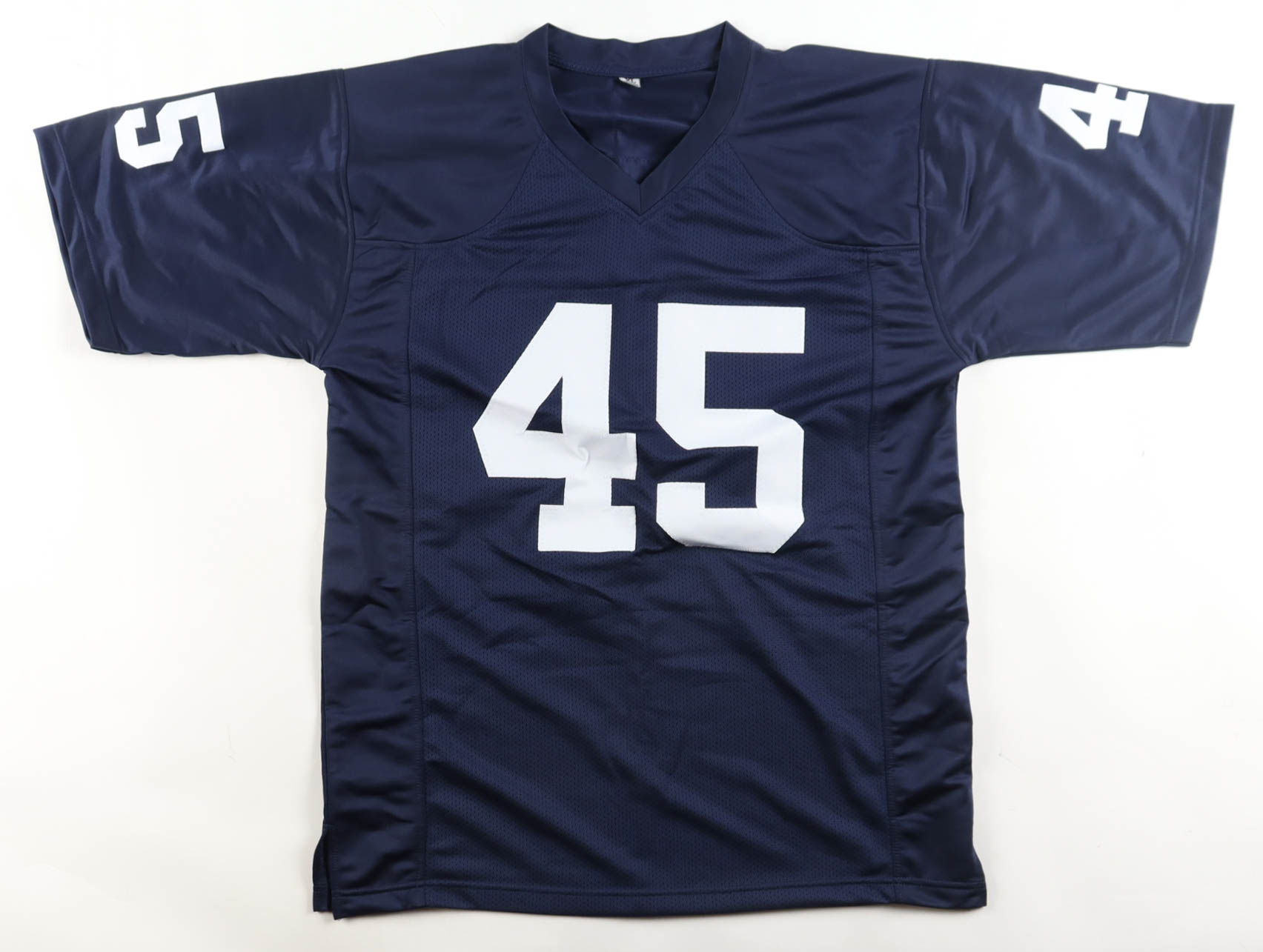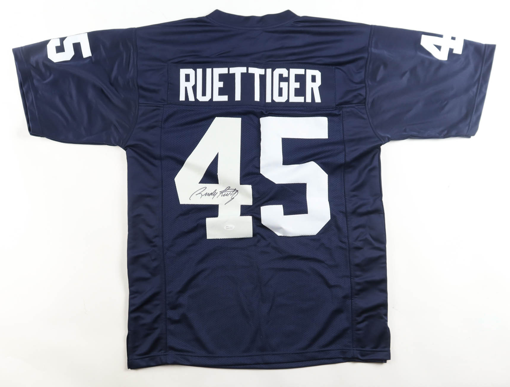 Custom jersey with everything sewn on, size XL. Hand-signed by Rudy Ruettiger. Please note, glue is visible through the reverse number and the number is discolored.