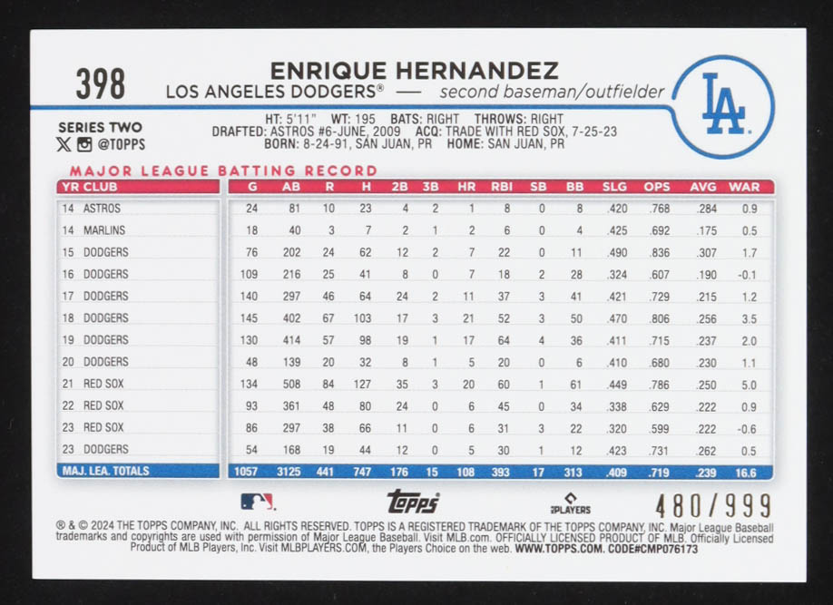 Enrique Hernandez 2024 Topps Blue Foil #398 #480/999