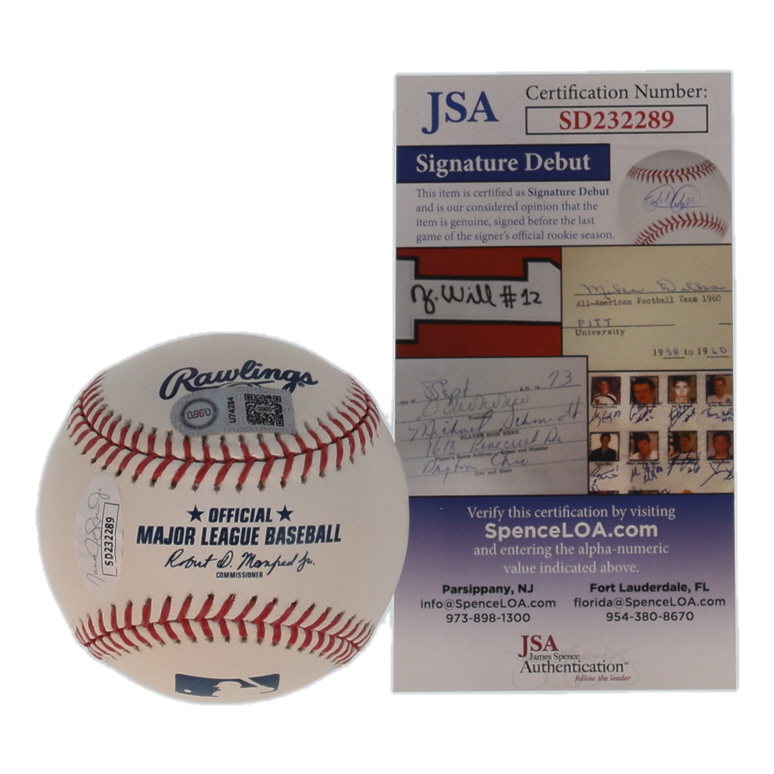 The autograph(s) includes an official James Spence Authentication (JSA) "Signature Debut" hologram. "Signature Debut" is the autographed memorabilia equivalent to a rookie card. The JSA definition of a "Signature Debut" is as follows: "Any item that is autographed and received by JSA prior to the last game of the signer's official rookie season.