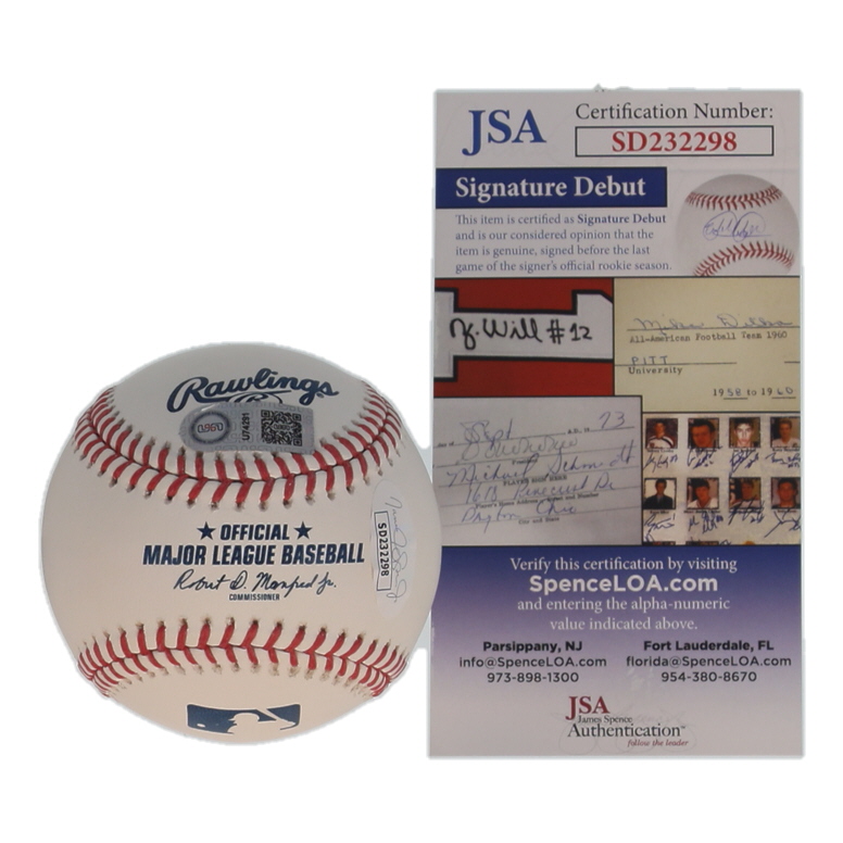 The autograph(s) includes an official James Spence Authentication (JSA) "Signature Debut" hologram. "Signature Debut" is the autographed memorabilia equivalent to a rookie card. The JSA definition of a "Signature Debut" is as follows: "Any item that is autographed and received by JSA prior to the last game of the signer's official rookie season.