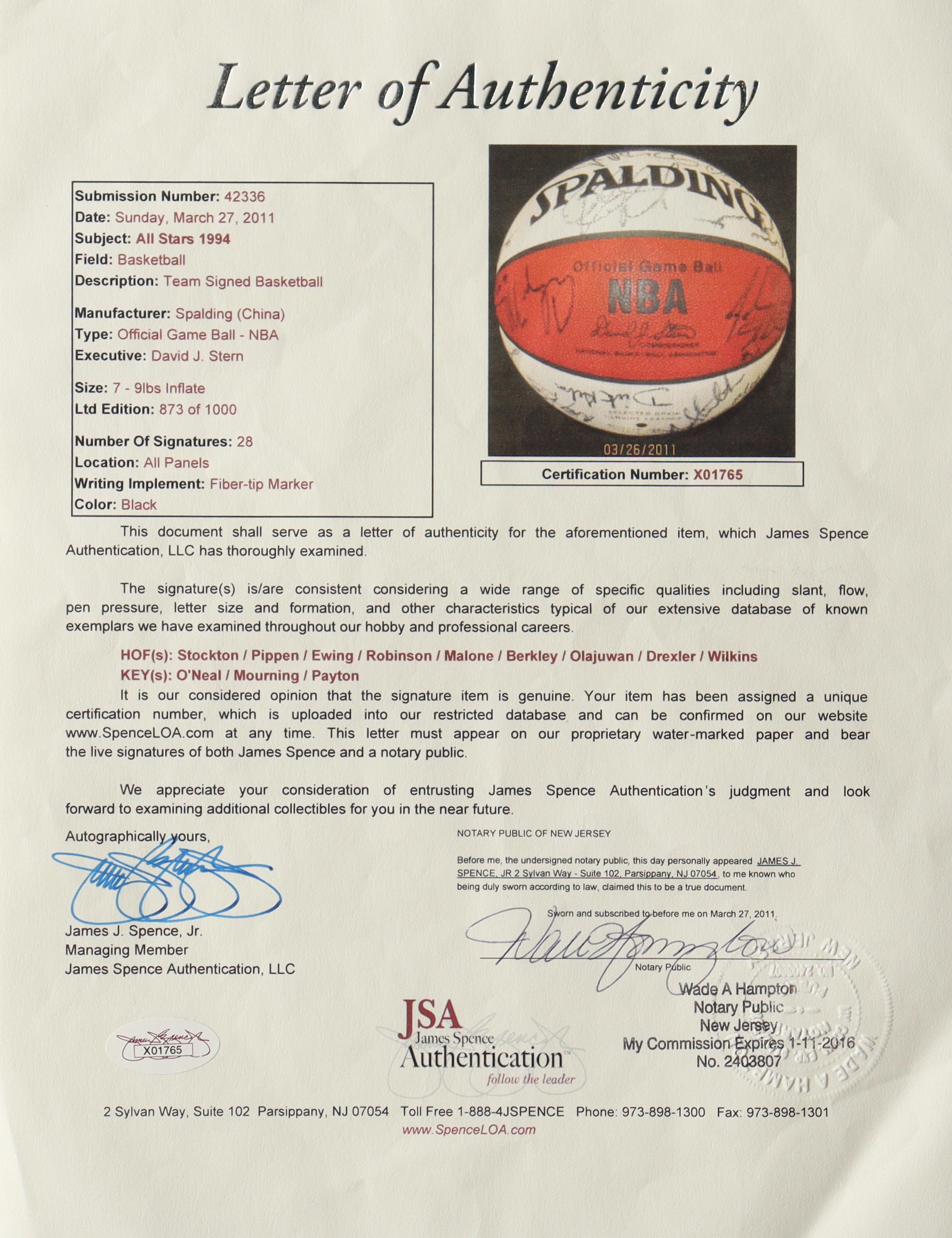 The basketball includes an official James Spence Authentication (JSA) hologram and matching LOA for authenticity purposes.