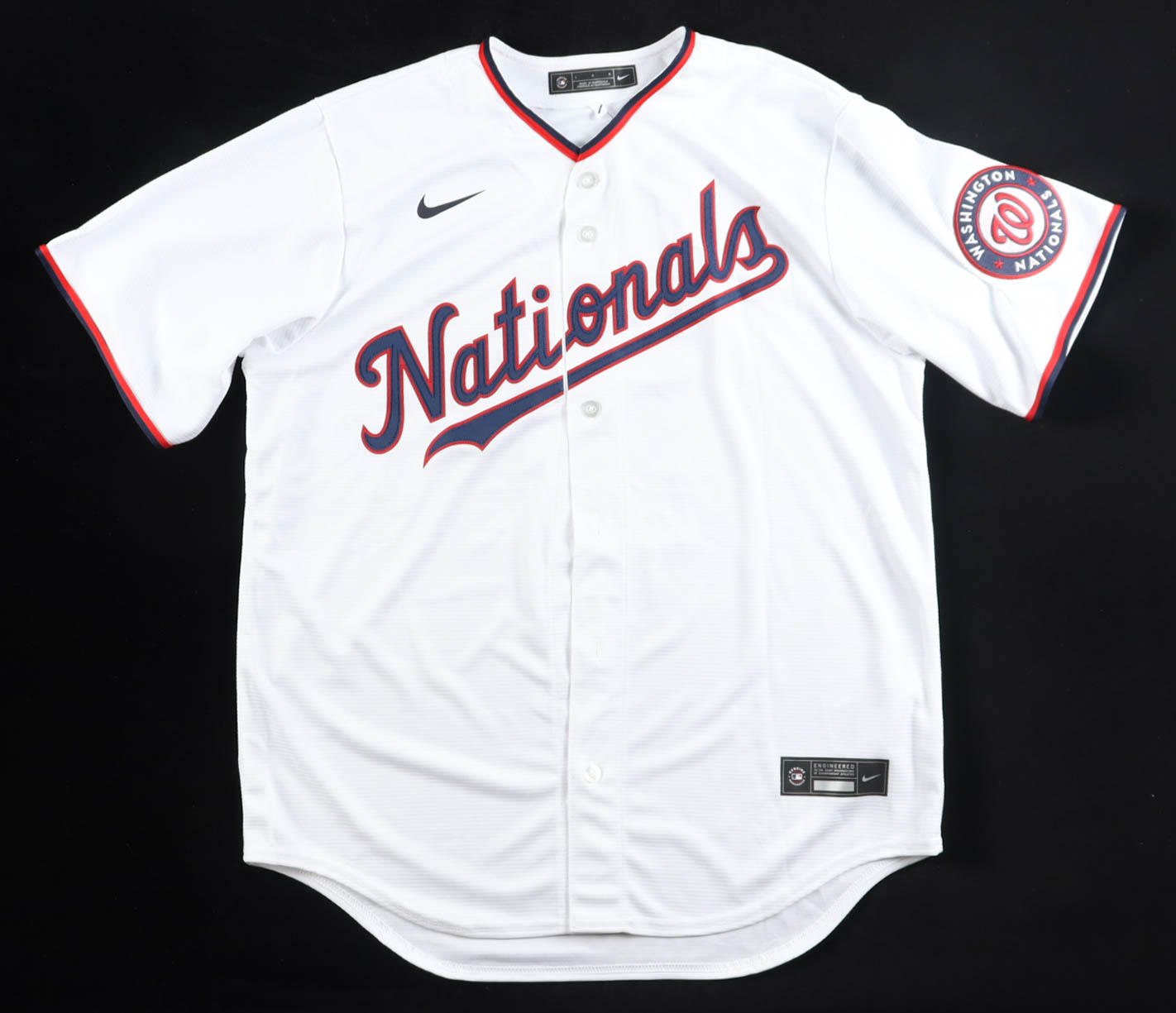 Nike jersey. Everything is pressed on, size L. Hand-signed by Dylan Crews (Washington Nationals).