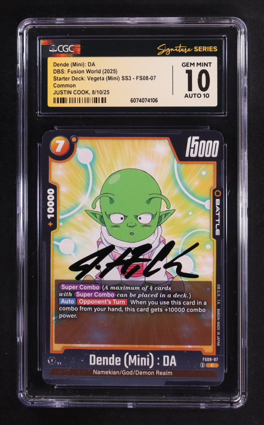 Justin Cook Signed 2025 DBS: Fusion World Starter Deck: Vegeta (Mini) #FS0807 Dende (Mini): DA (CGC 10 | Auto 10)