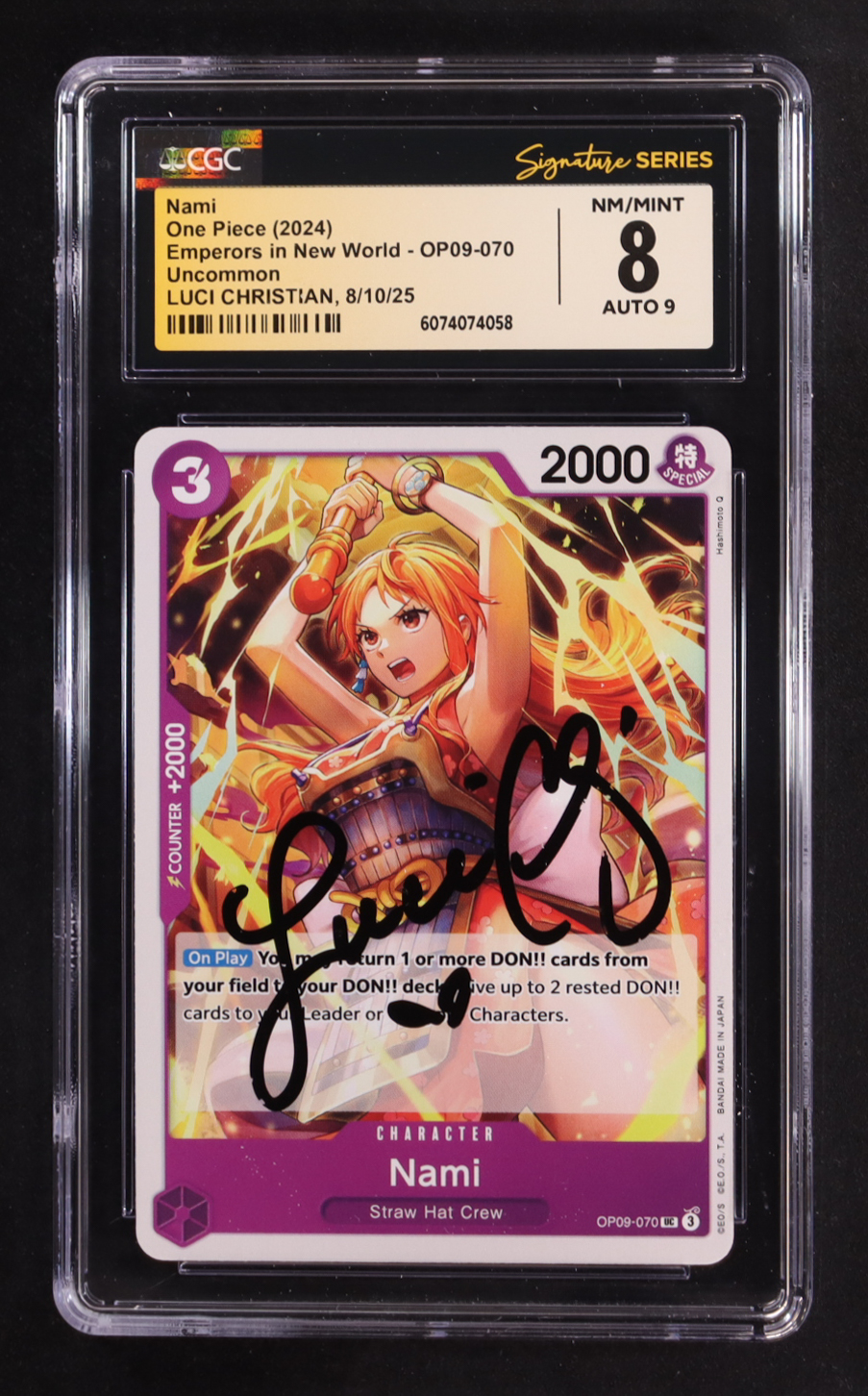 Luci Christian Signed 2024 One Piece Card Game Emperors in the New World #OP09070 Nami (CGC 8 | Auto 9)