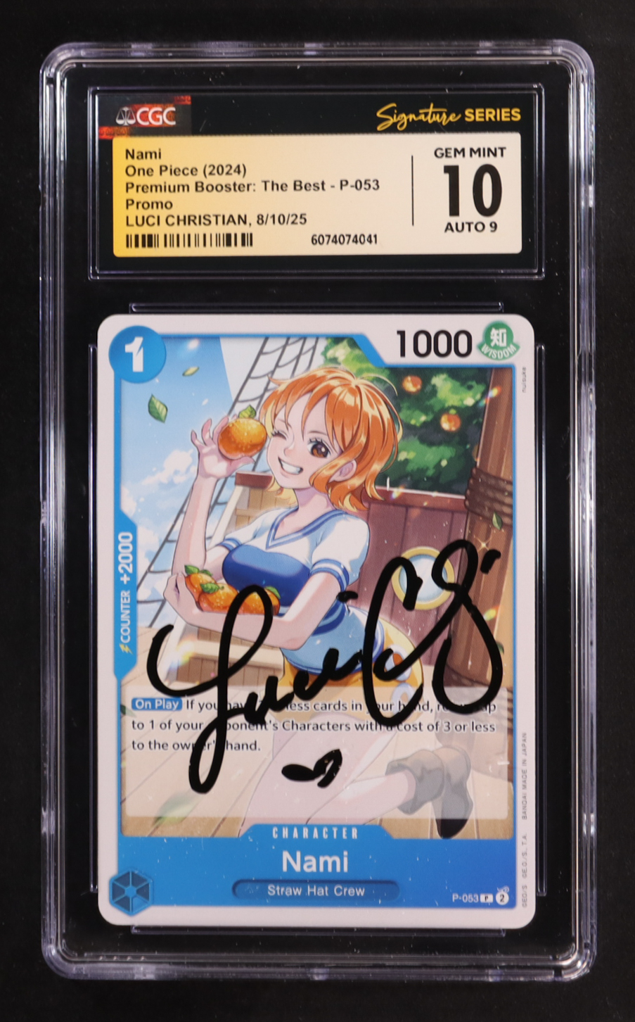 Luci Christian Signed 2024 One Piece Card Game ONE PIECE CARD THE BEST Premium Booster #P053 Nami (CGC 10 | Auto 9)