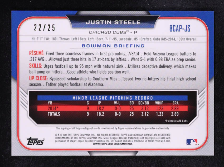 Justin Steele 2015 Bowman Chrome Prospect Autographs Orange Refractors #BCAPJS #22/25 RC