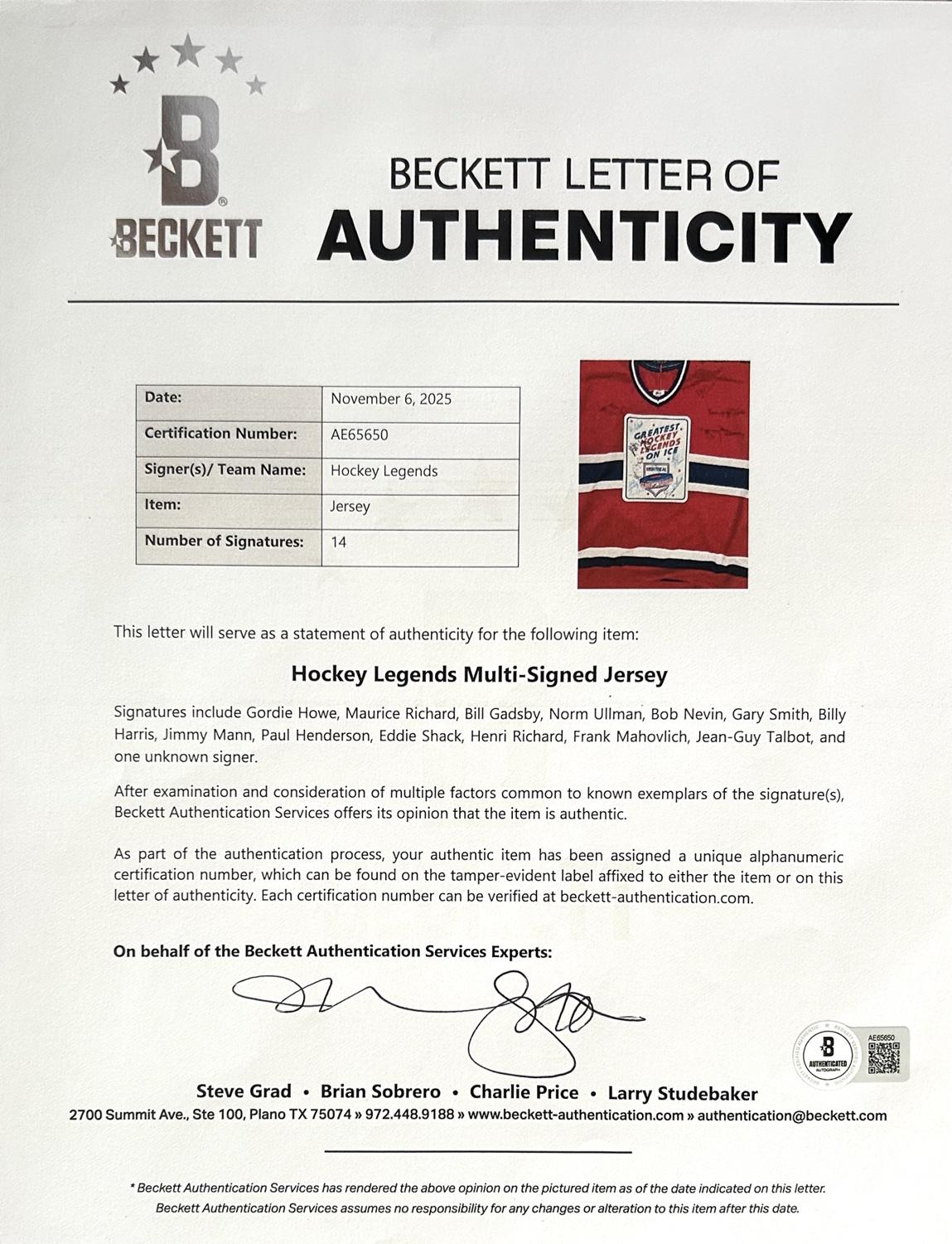 Sports Maska Greatest Hockey Legends jersey, size XXL. Has hand-signed and inscribed by Gordie Howe (D. 2016), Maurice Richard (D. 2000), Bill Gadsby (D. 2016), Norm Ullman, Bob Nevin (D. 2020), Gary Smtih, Billy Harris, Jimmy Mann, Paul Henderson, Eddie Shack (D. 2020), Henri Richard (D. 2020), Frank Mahovlich, Jean-Guy Talbot (D. 2024), and one unknown signer.