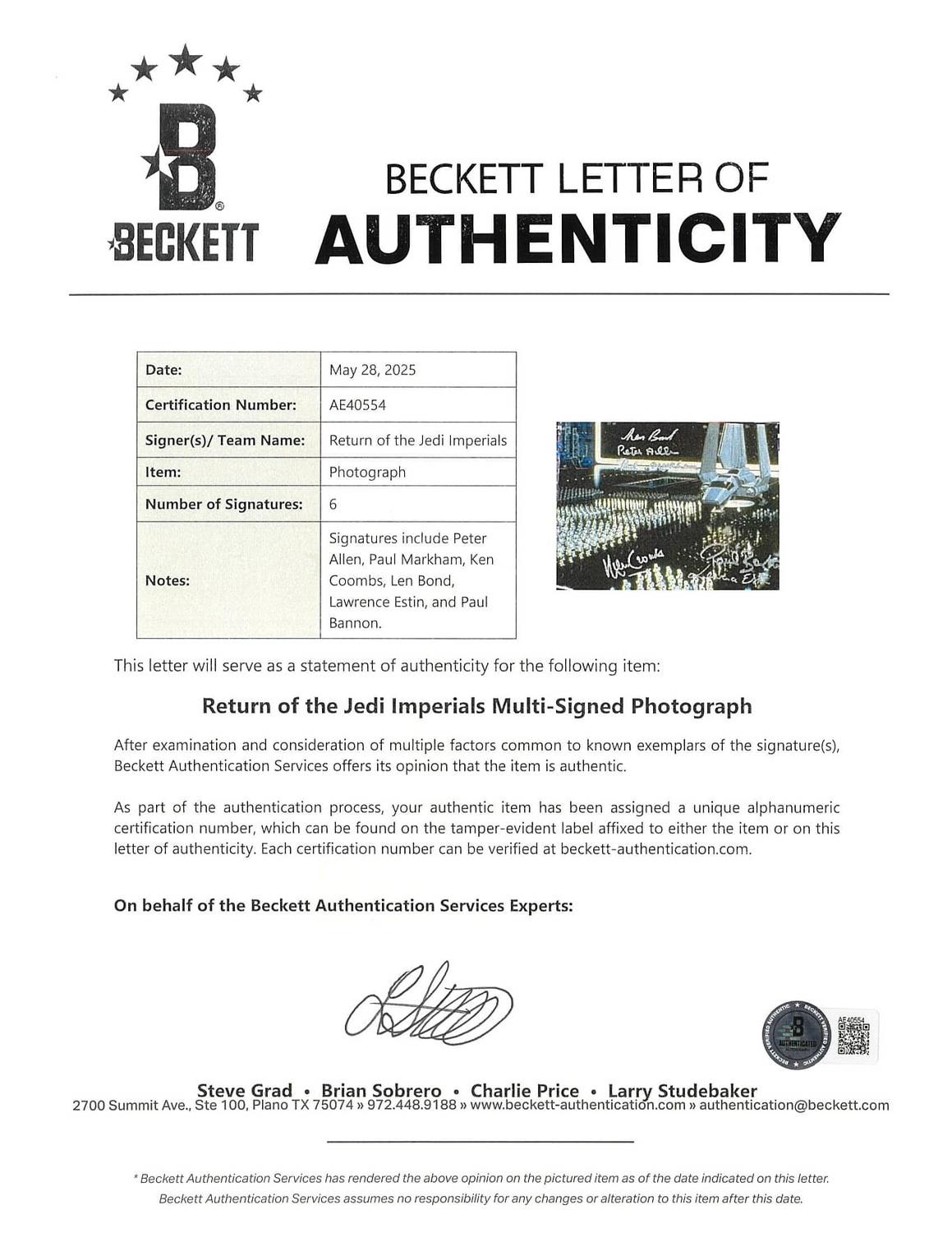 "Star Wars: Episode VI Return of the Jedi" Stormtroopers 8x10 Photo Signed & Inscribed By (6) Peter Allen, Paul Markham, Ken Coombs (Beckett)