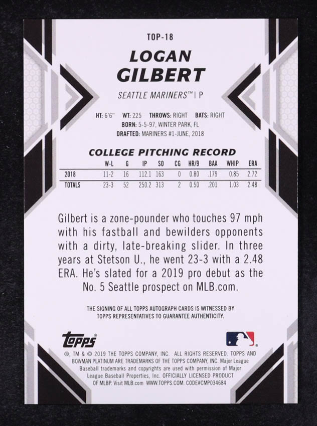 Logan Gilbert 2019 Bowman Platinum Top Prospect Autographs #TOP18 RC