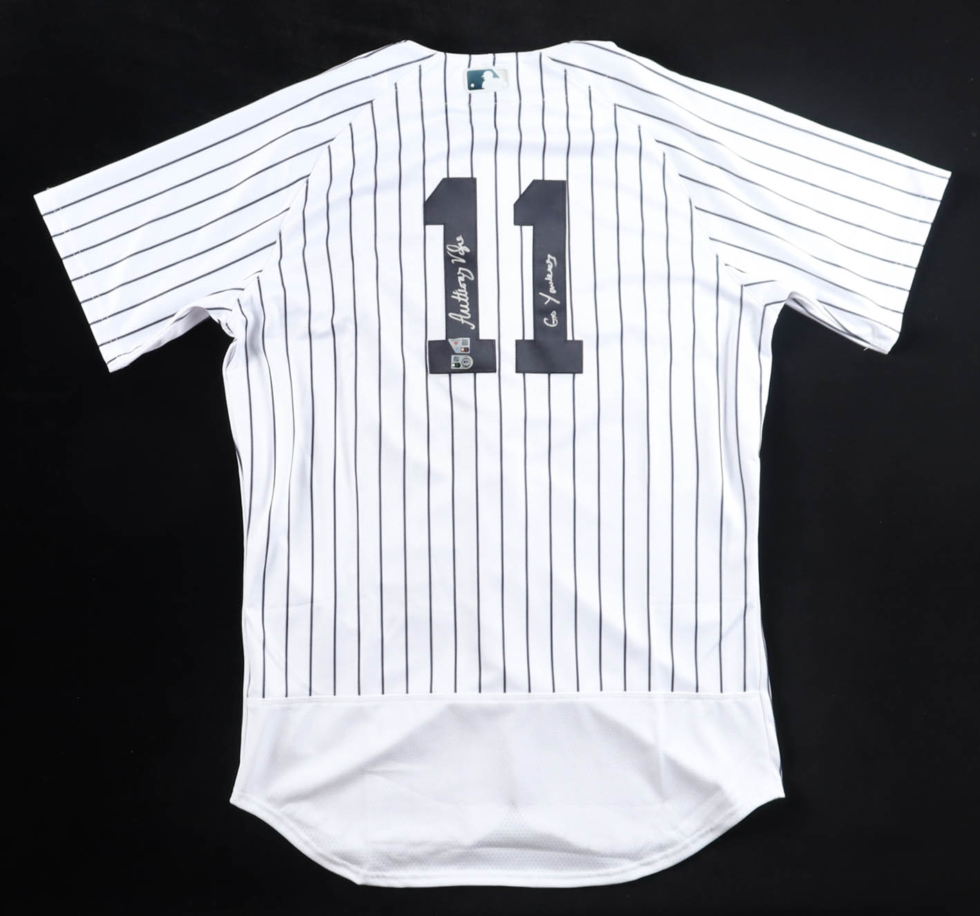 Nike authentic jersey with everything sewn on, size 44. Hand-signed and inscribed by Anthony Volpe.