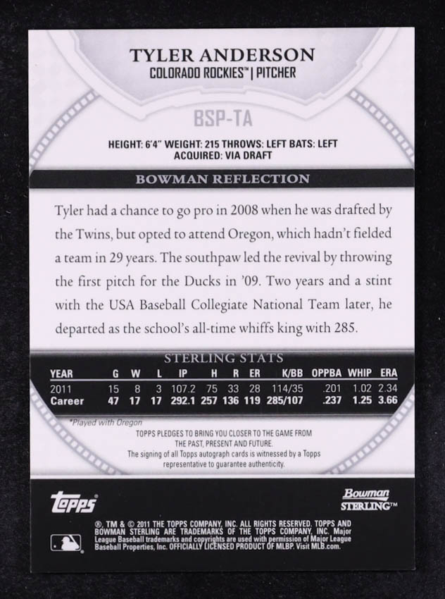 Tyler Anderson 2011 Bowman Sterling Prospect Autographs #TA RC