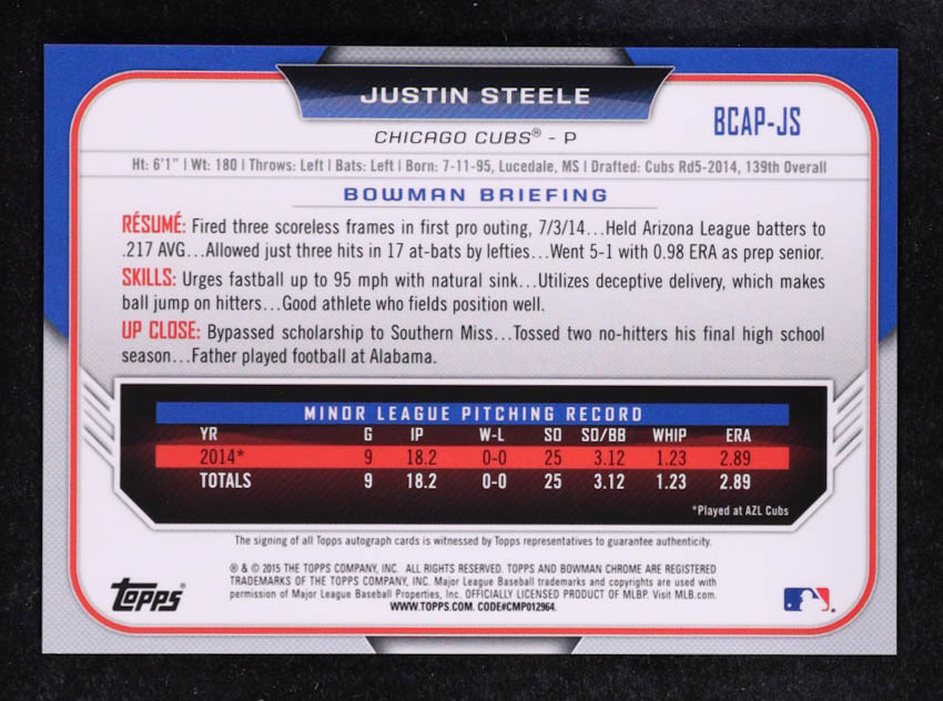 Justin Steele 2015 Bowman Chrome Prospect Autographs #BCAPJS RC