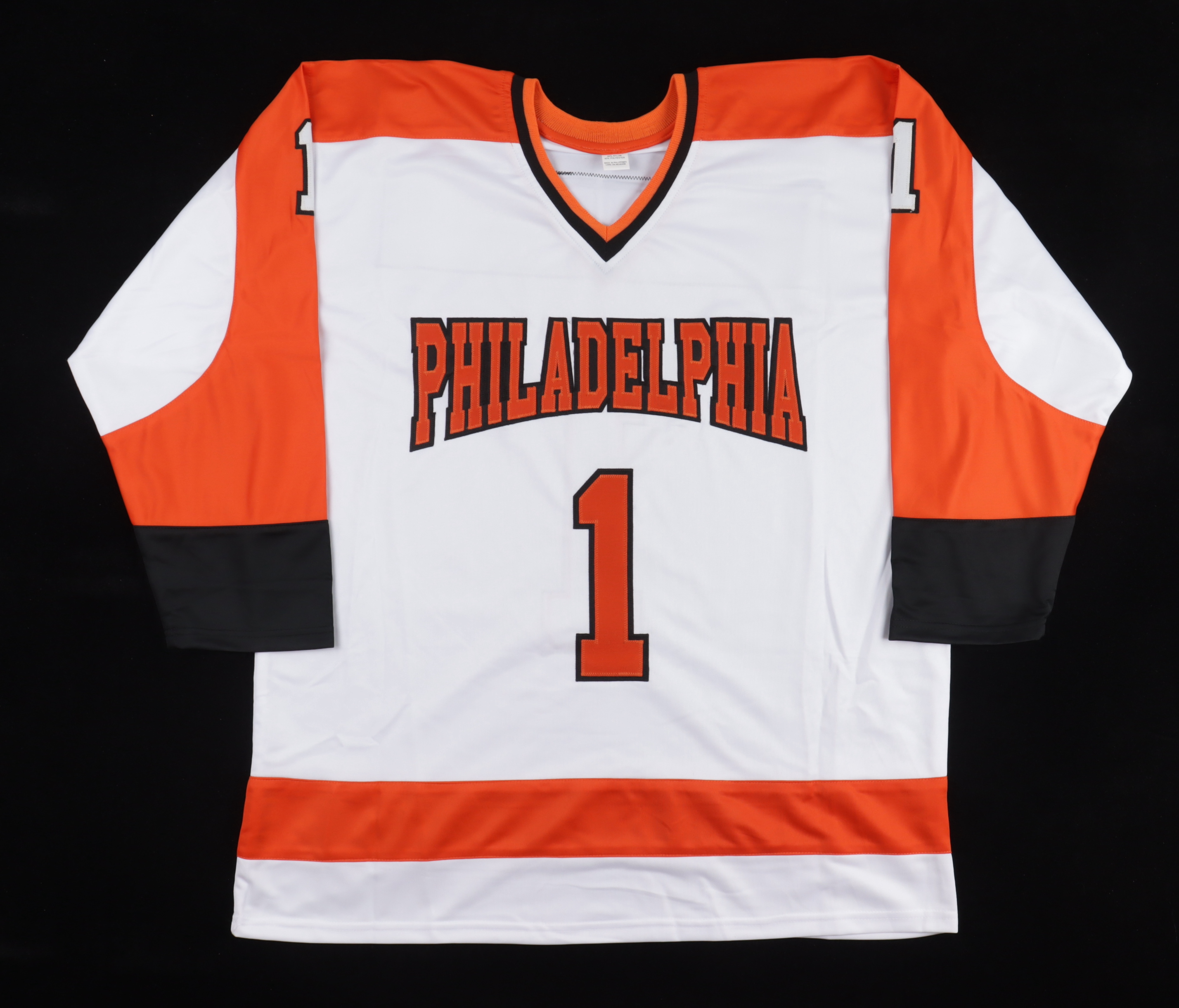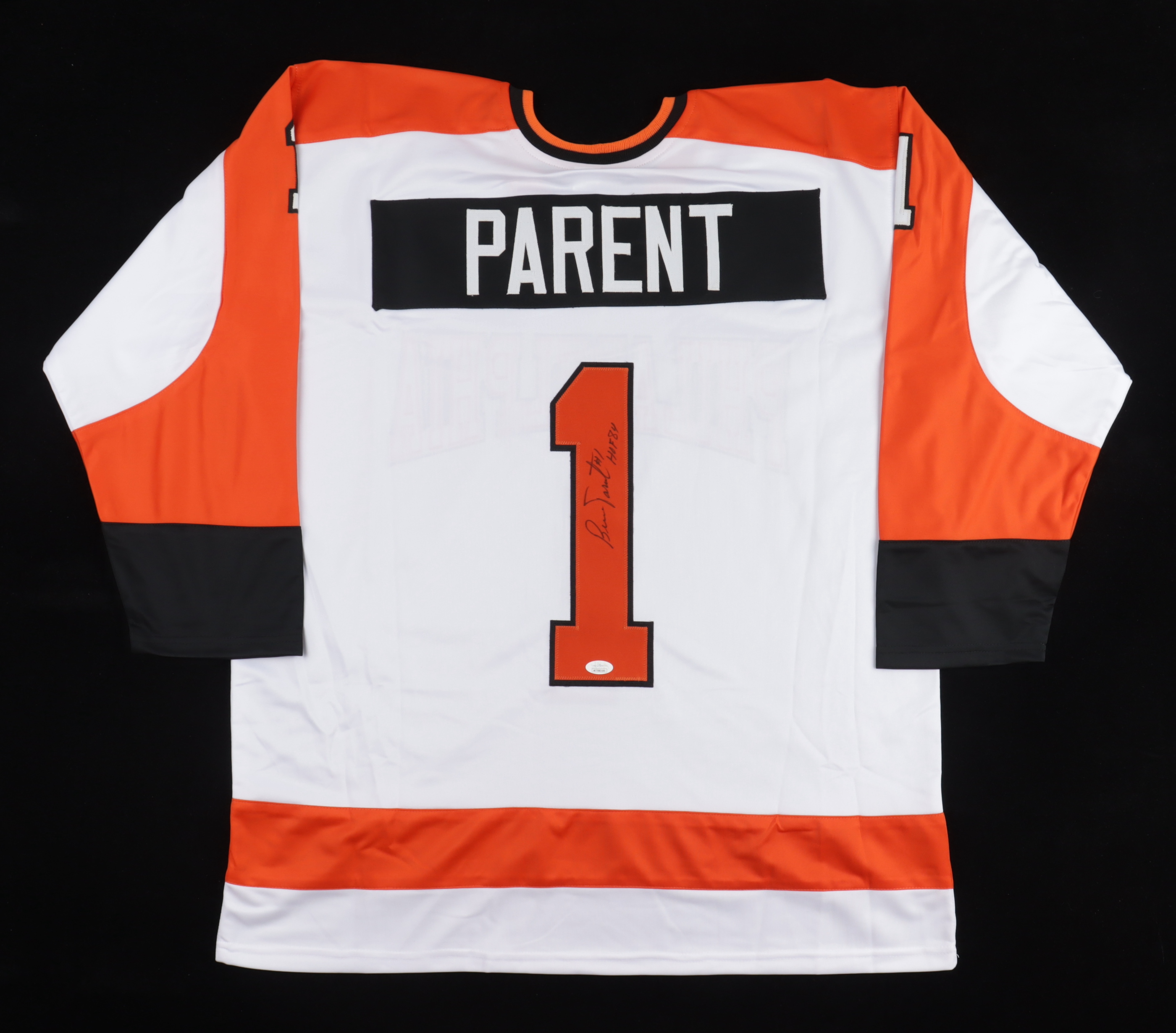 Custom jersey with everything sewn on, size XL. Hand-signed and inscribed by Bernie Parent (HOF).