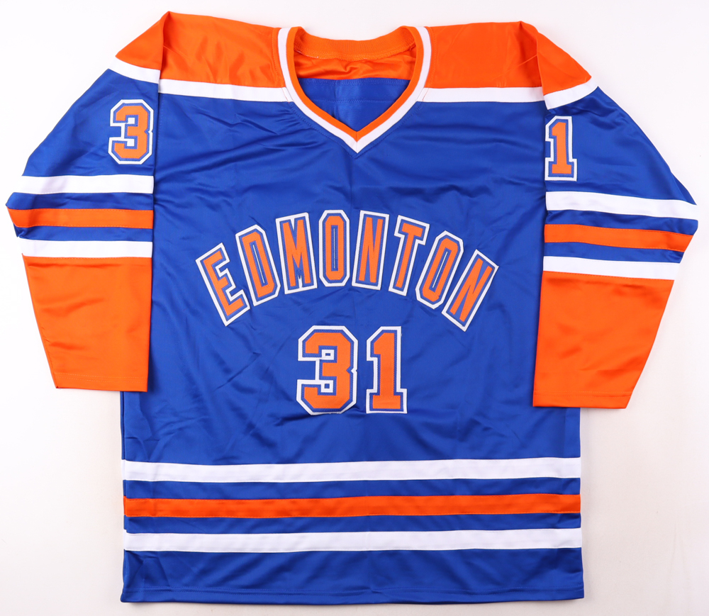 Custom jersey with everything sewn on, size XL. Has been hand-signed and inscribed by Grant Fuhr (HOF).