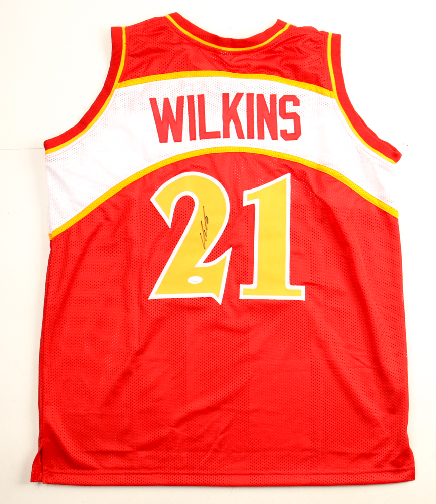 Custom jersey with everything sewn on, size XL. Hand-signed by Dominique Wilkins (HOF).