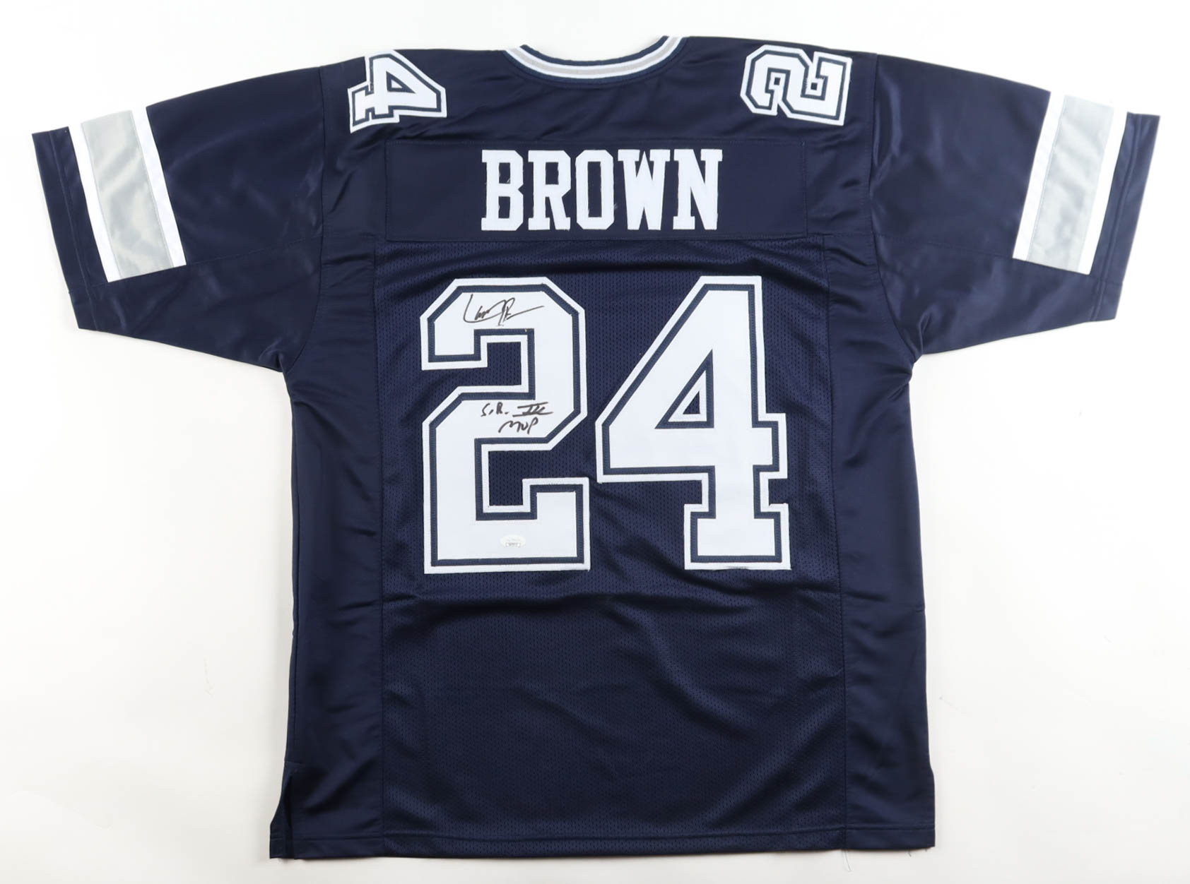 Custom jersey with everything sewn on, size XL. Hand-signed and inscribed by Larry Brown.