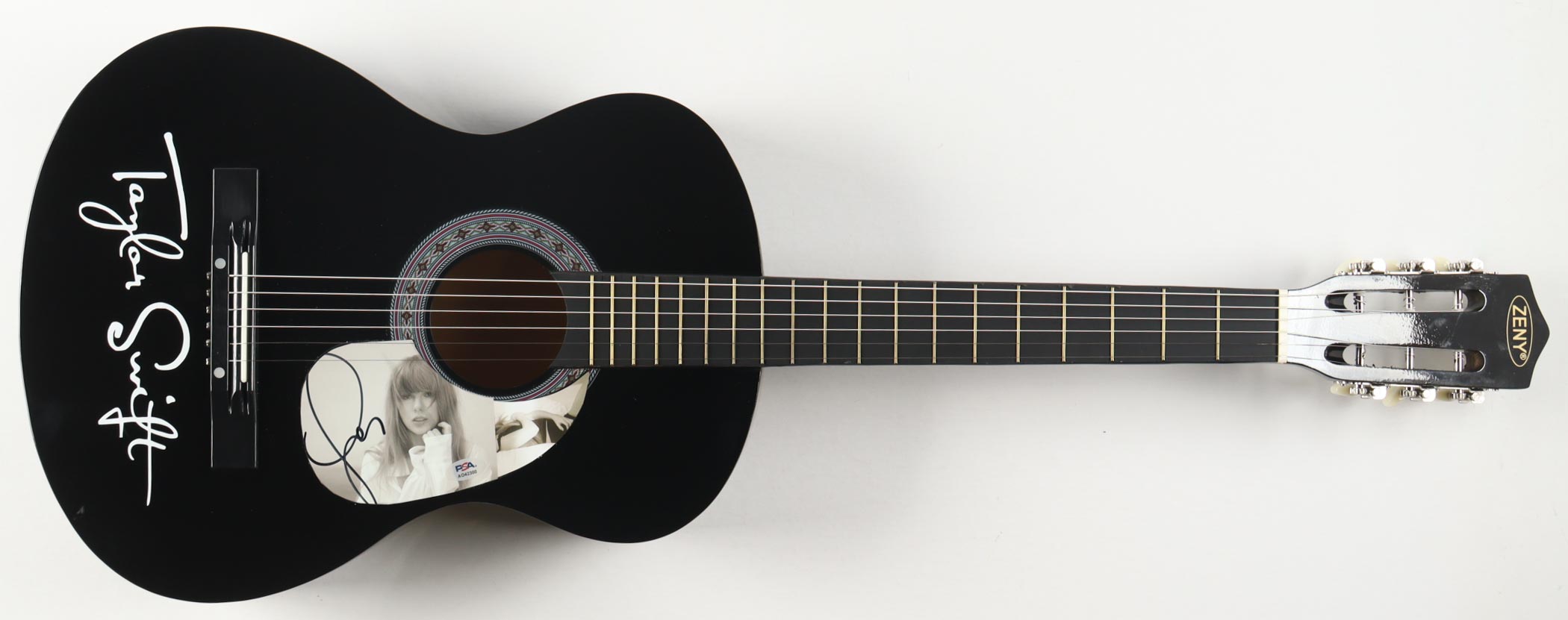 Zeny Acoustic guitar measures approximately 38" in length and has been hand-signed by Taylor Swift on a CD insert that has been repurposed as a pickguard.