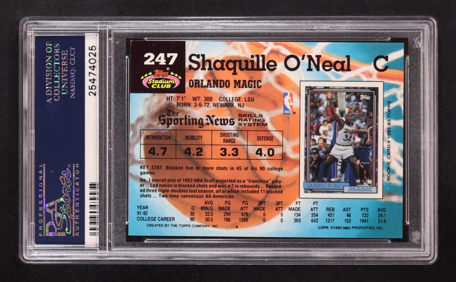 Shaquille O'Neal 1992-93 Stadium Club #247 RC (PSA 9)