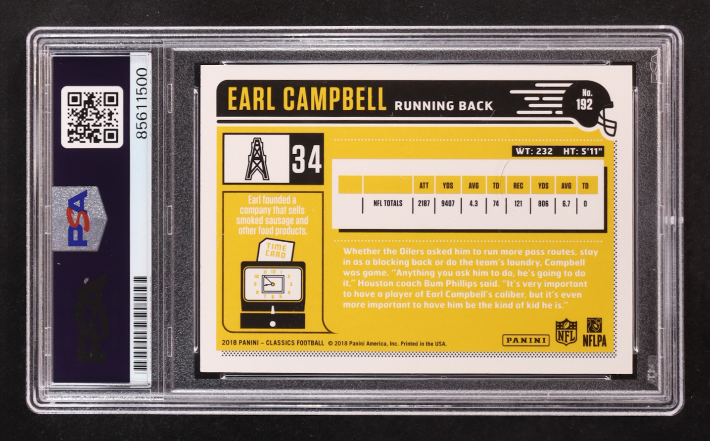 Earl Campbell Signed 2018 Classics #192 (PSA Encapsulated)