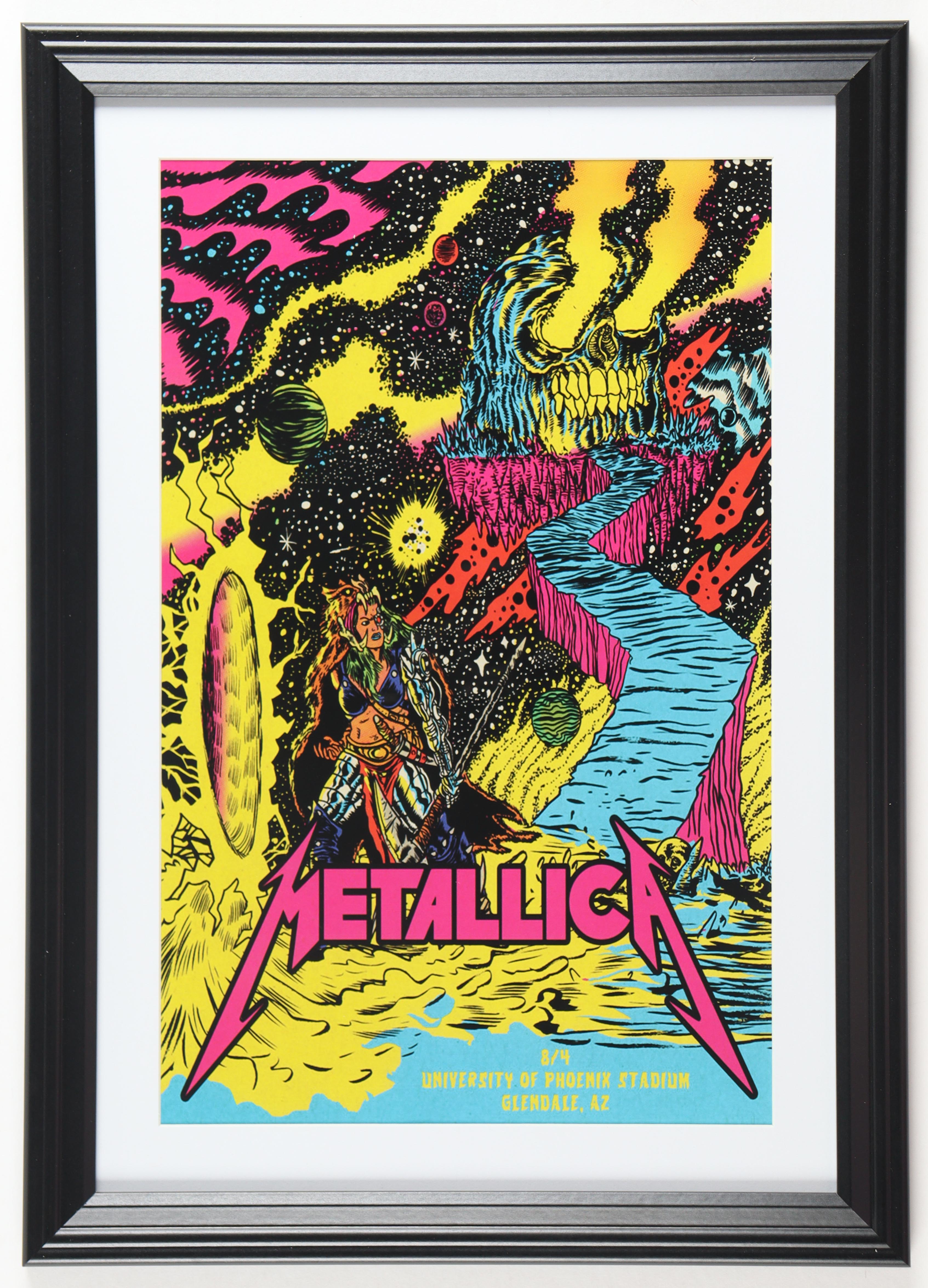 Custom frame measures approximately 15" x 21" in size. The display features a Metallica University of Phoenix Stadium concert print. Please note frame is unsigned. Refer to photo regarding the condition of the item.