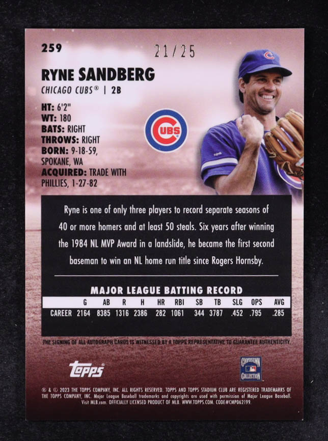 Ryne Sandberg 2023 Stadium Club Chrome Insert Autographs Refractors #259 #21/25
