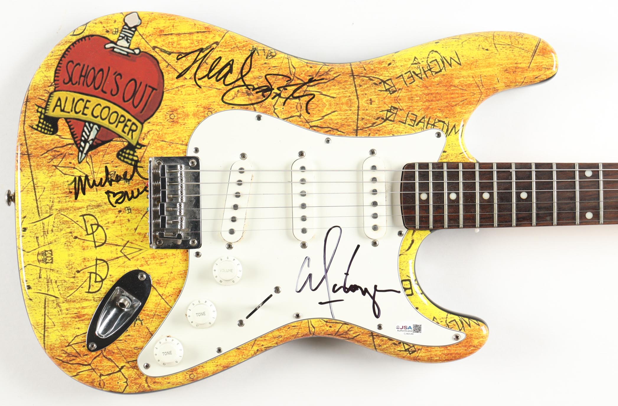 Full-size electric guitar measures approximately 39" in length and is hand-signed on the body by Alice Cooper, Michael Bruce, & Neal Smith.