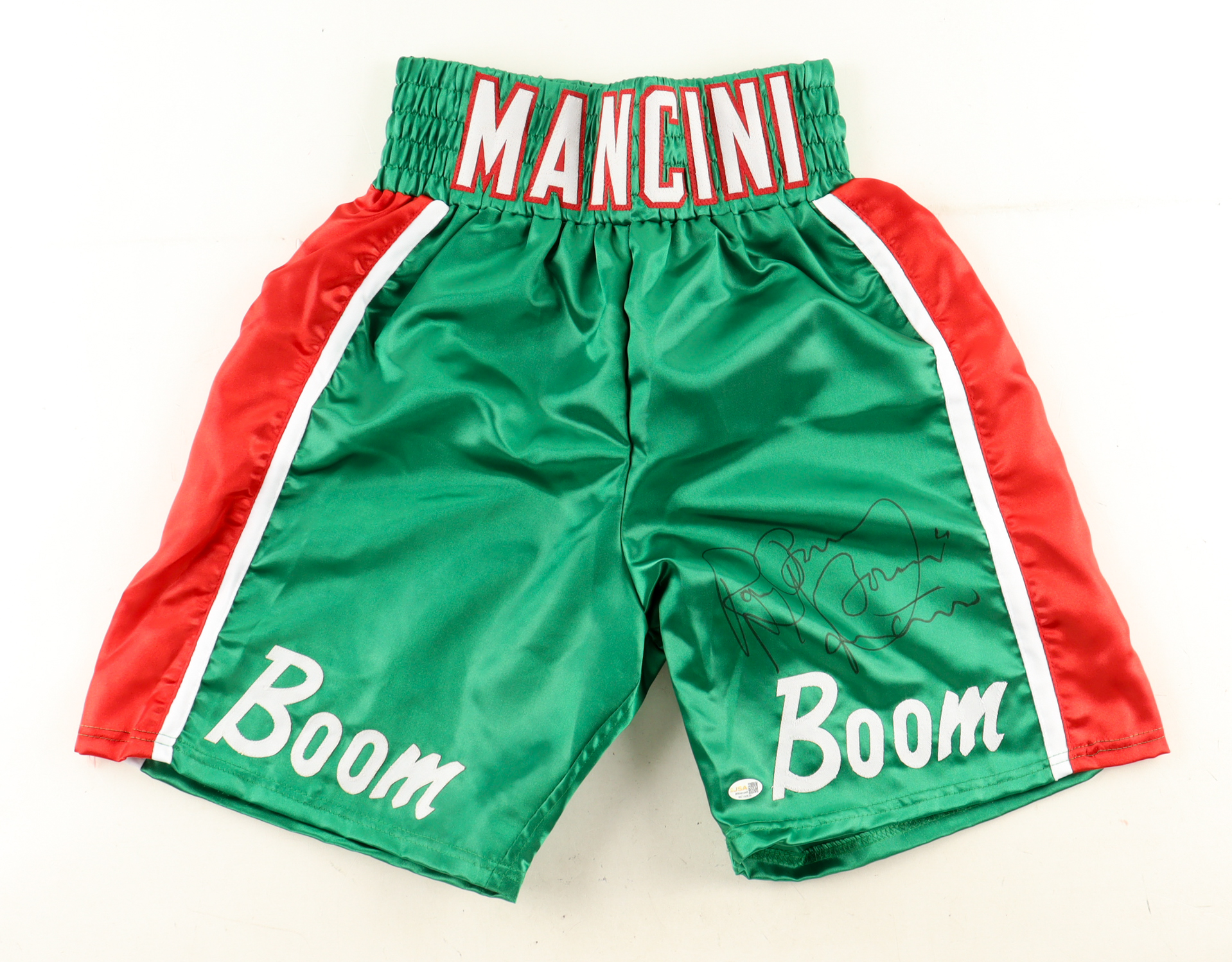 Boxing shorts have been hand-signed by Ray "Boom Boom" Mancini (HOF).