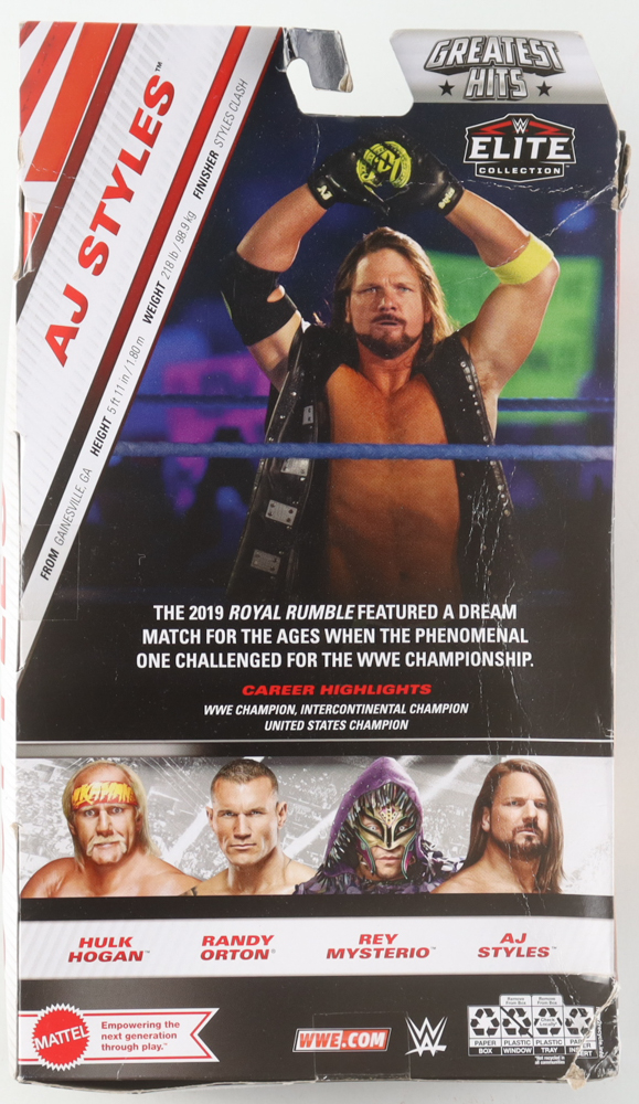 Action figure measures approximately 6" in height and is hand-signed on the packaging by AJ Styles.