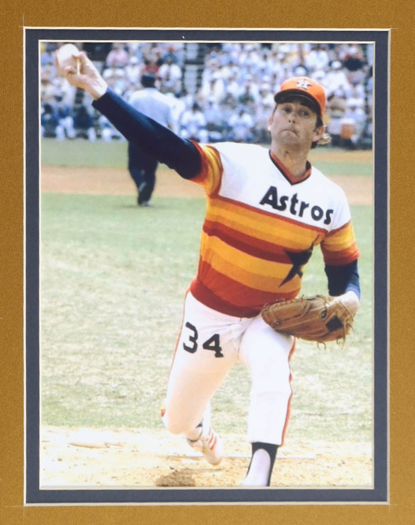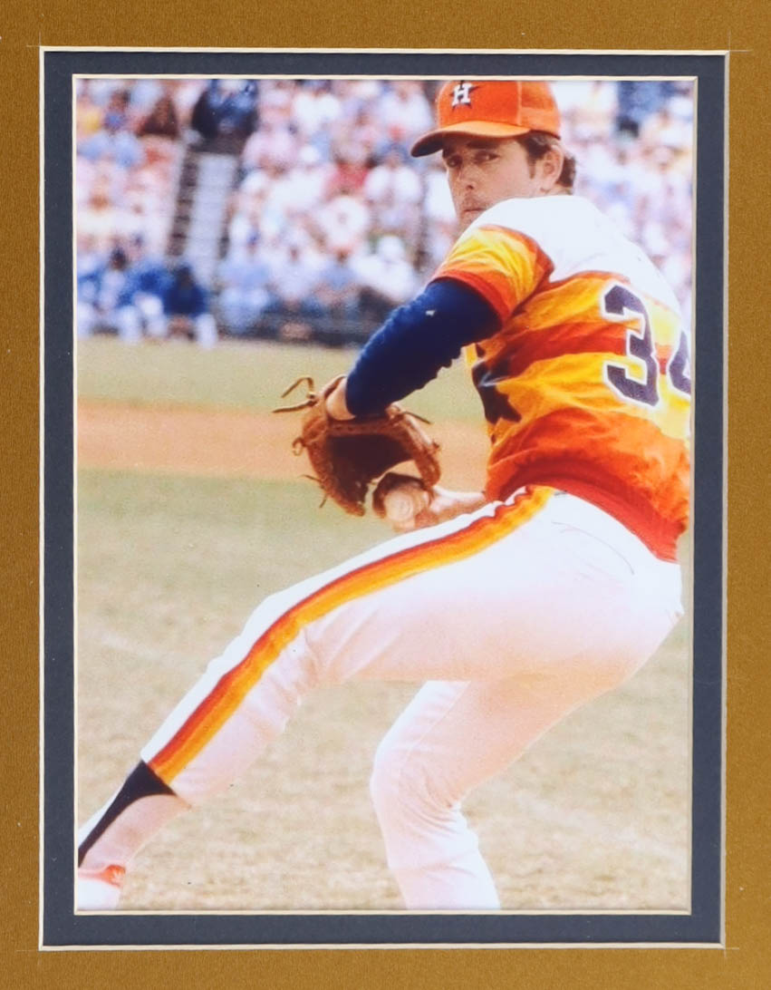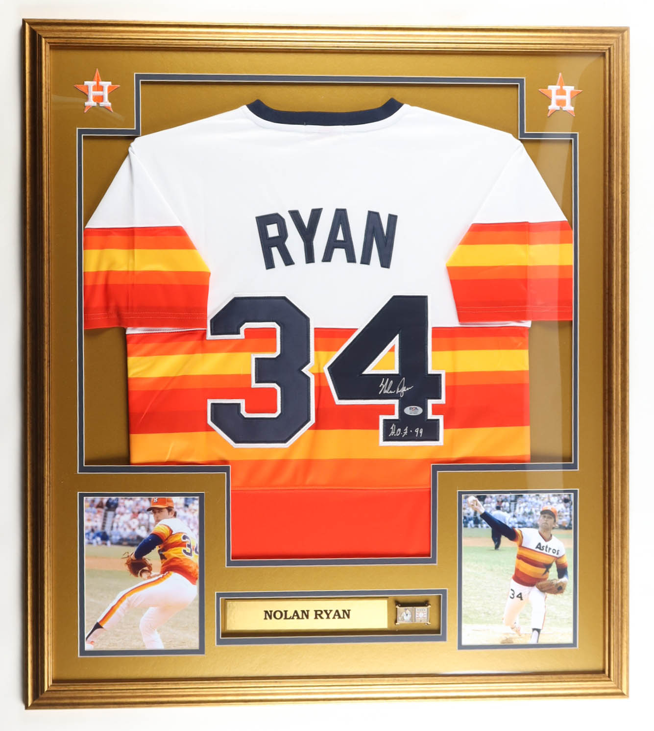 Custom frame display measures approximately 32" x 36" in size and features a jersey that has been hand-signed and inscribed by Nolan Ryan (Houston Astros, HOF). The display also includes an official brass hall of fame pin, (2) 8"x 10" photos, (2) cloth team logo patches, and title plaque.