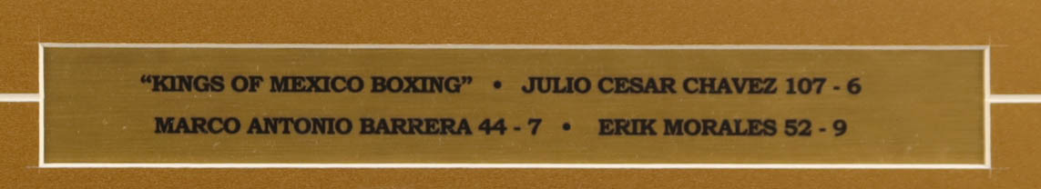 Custom frame measures approximately 29" x 36" in size and features a Mexican flag that has been hand-signed by (3) Julio Cesar Chavez (HOF), Marco Antonio Barrera (HOF) and Erik Morales (HOF). Please note, border has been dented and scuffed. Refer to photos regarding the condition of the item.
