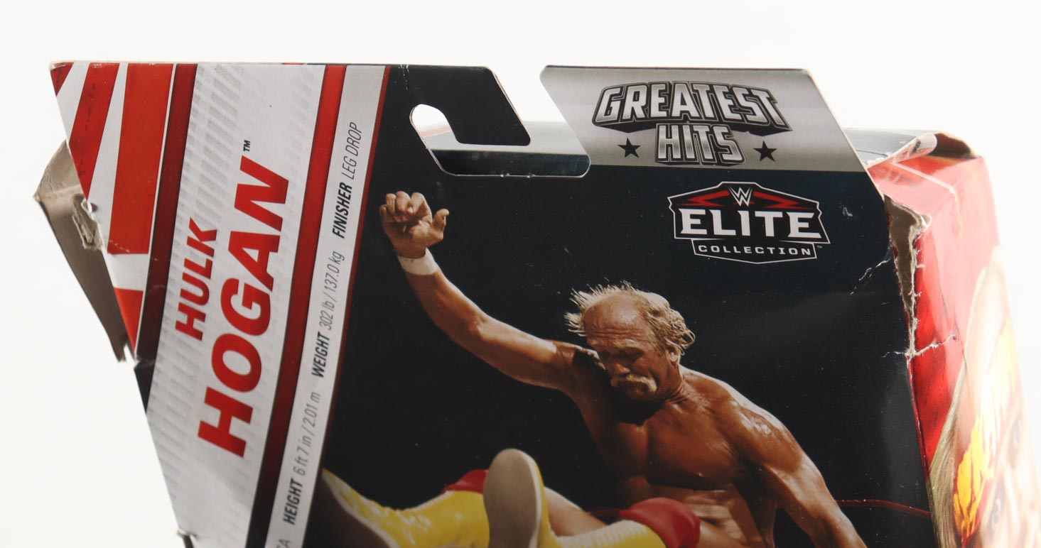 2024 Mattel WWE Greatest Hits Elite Collection action figure measures approximately 6" in height and has been hand-signed on the packaging by Hulk Hogan (D. 2025, HOF). Please note, the top of the box is significantly damaged. See photos for more detail regarding the condition of the item.