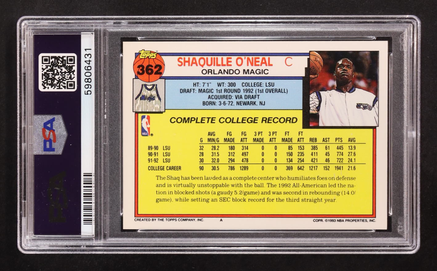 Shaquille O'Neal 1992-93 Topps #362 RC (PSA 9)