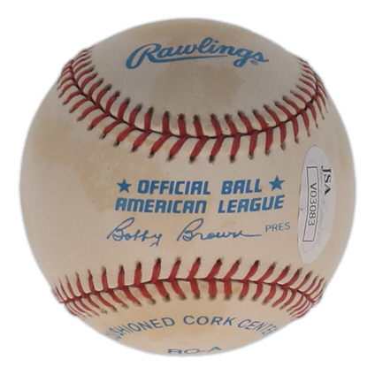 Rawlings Official American League Baseball. Hand-signed by Early Wynn (D. 1999, Cleveland Indians, HOF). Please note, the baseball is naturally toned and stained.
