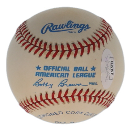 Rawlings Official American League Baseball. Hand-signed and inscribed by Reggie Jackson (Oakland Athletics, HOF). Please note, the baseball is naturally toned.