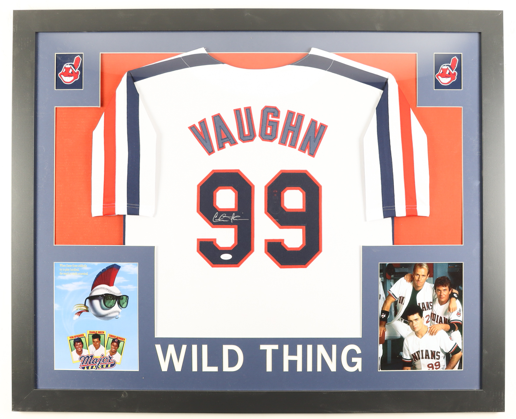 Custom frame measures 35.5" x 43.75" and features a jersey hand-signed by Charlie Sheen (Ricky "Wild Thing" Vaughn). Please note that the 8" x 10" photos may be in reverse order.