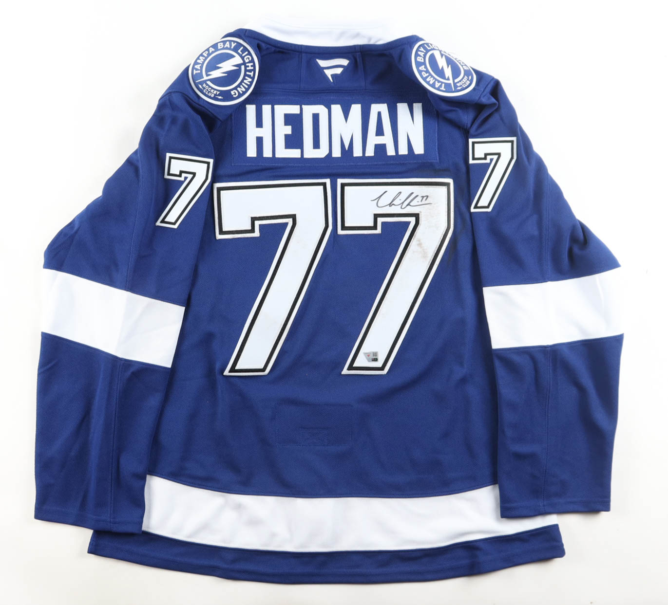 Fanatics authentic jersey with everything sewn on, size 54. Hand-signed by Victor Hedman (Tampa Bay Lightning). Please note, there is staining on and near the reverse number. See photos regarding the condition of the item.