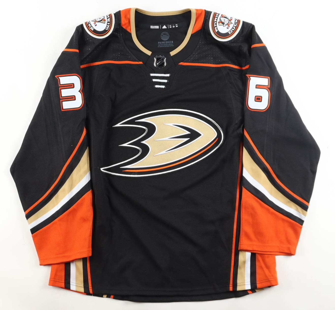 Adidas jersey with everything sewn on, size 54. Hand-signed by John Gibson (Anaheim Ducks). Please note, there is staining on the reverse number and back of the jersey.
