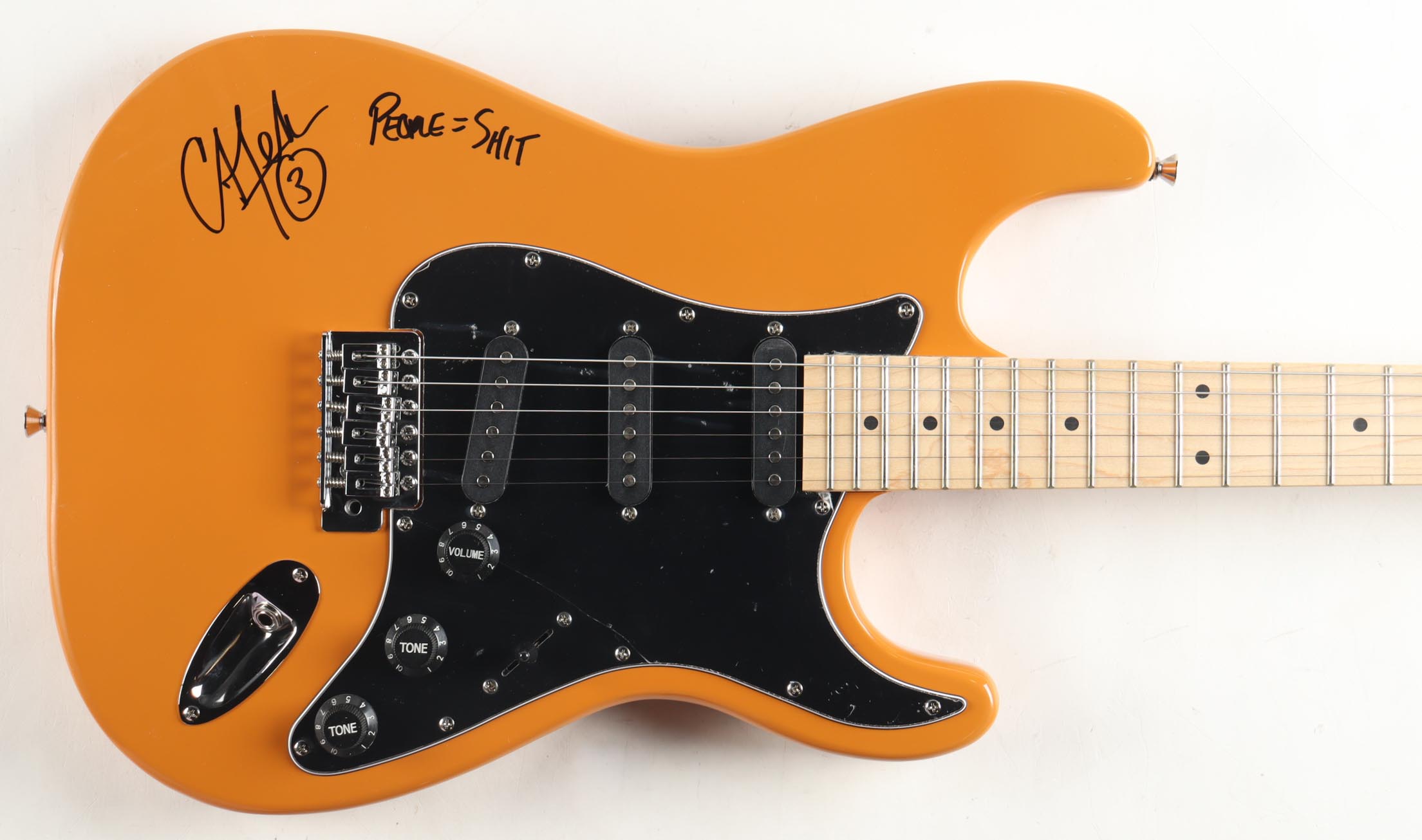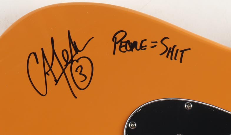 Electric guitar has been hand-signed and inscribed on the pick guard by Chris Fehn.