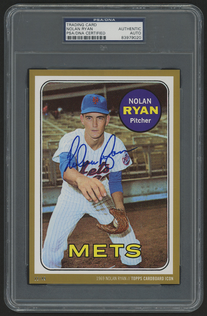 2015 Topps Cardboard Icons #533 jumbo baseball card measures 5" x 7" in size and has been hand signed in blue felt tip pen by Nolan Ryan (Mets, HOF). Please see scans for details regarding the condition of the card.