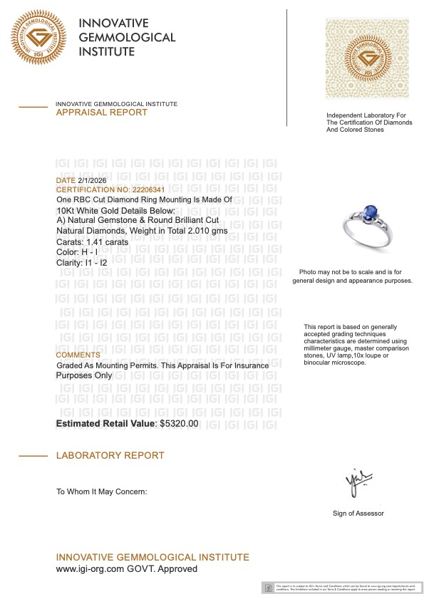 This piece includes paperwork from the Innovative Gemological Institute (IGI).