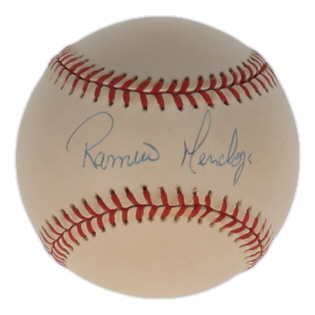 Rawlings Official American League Baseball. Hand-signed by Ramiro Mendoza (New York Yankees). Please note, the baseball is naturally toning and stained.