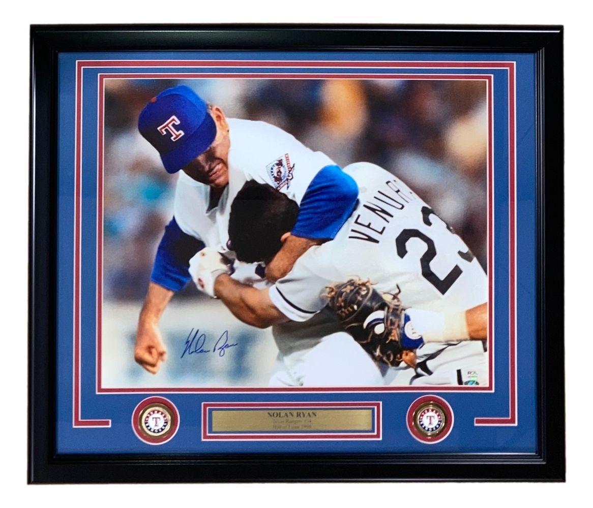 Custom frame measures 22” x 27” in size and features a photo that has been hand-signed by Nolan Ryan (Texas Rangers).