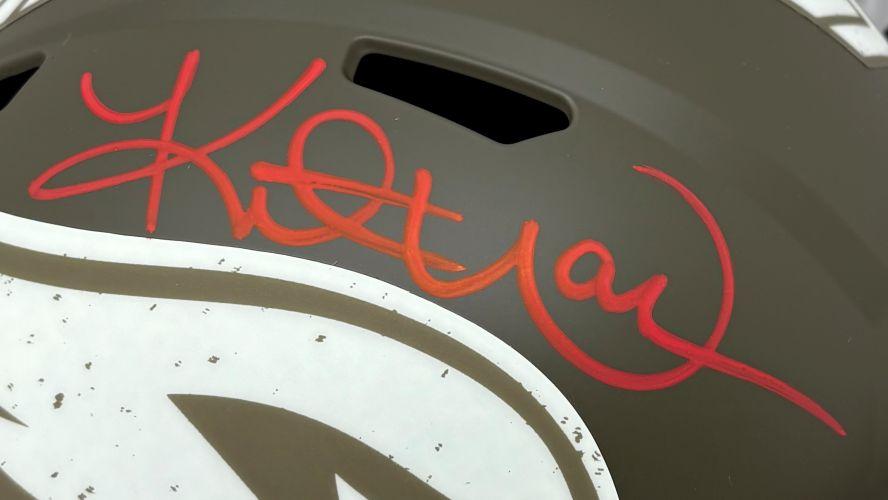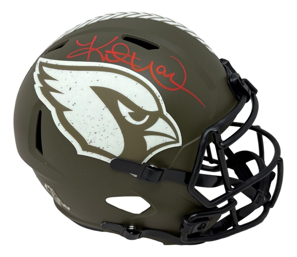 Riddell Arizona Cardinals full-size salute to service alternate speed replica helmet has been hand-signed by Kurt Warner (HOF).