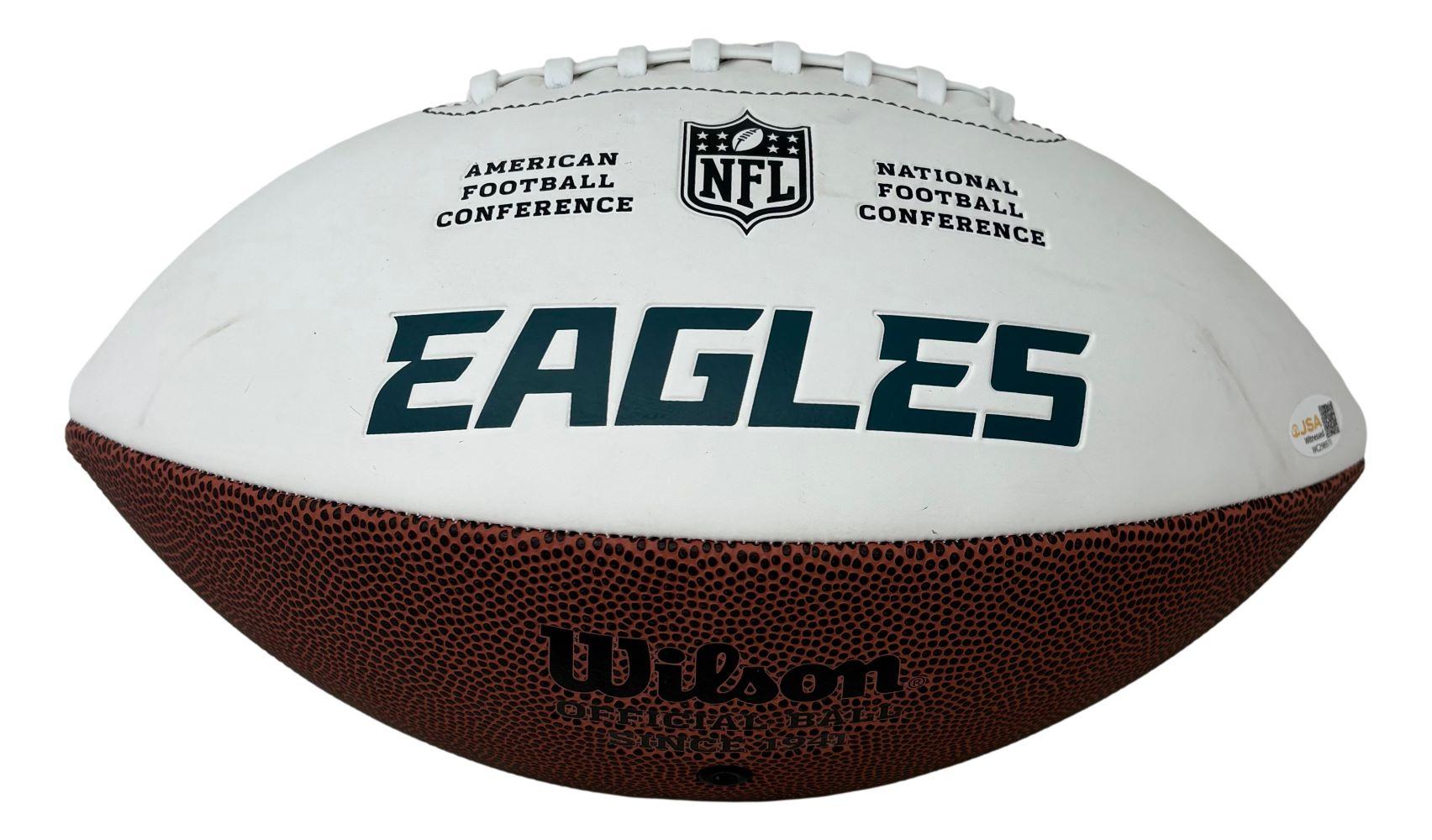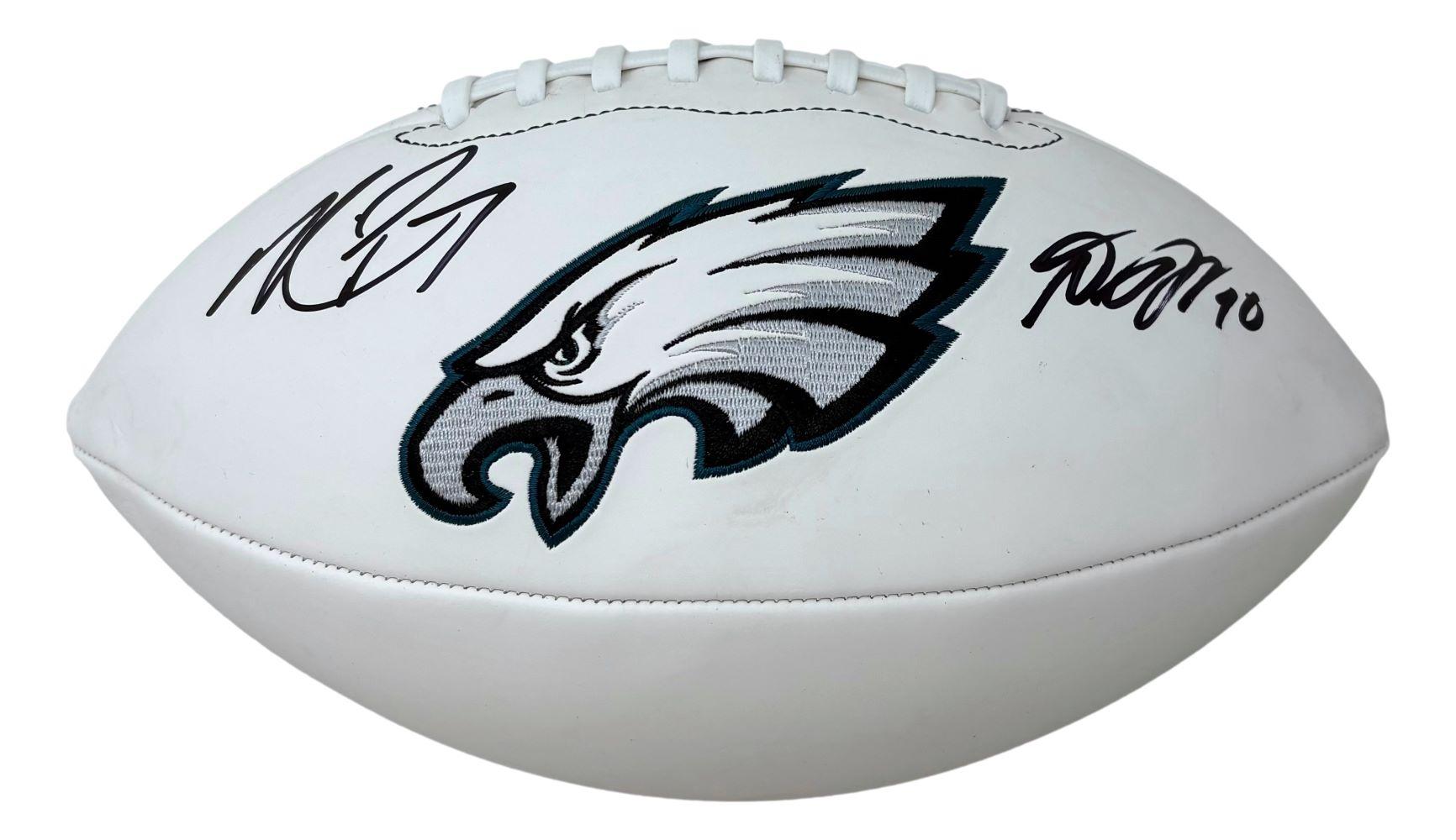 Philadelphia Eagles logo football has been hand-signed by DeSean Jackson and Michael Vick.