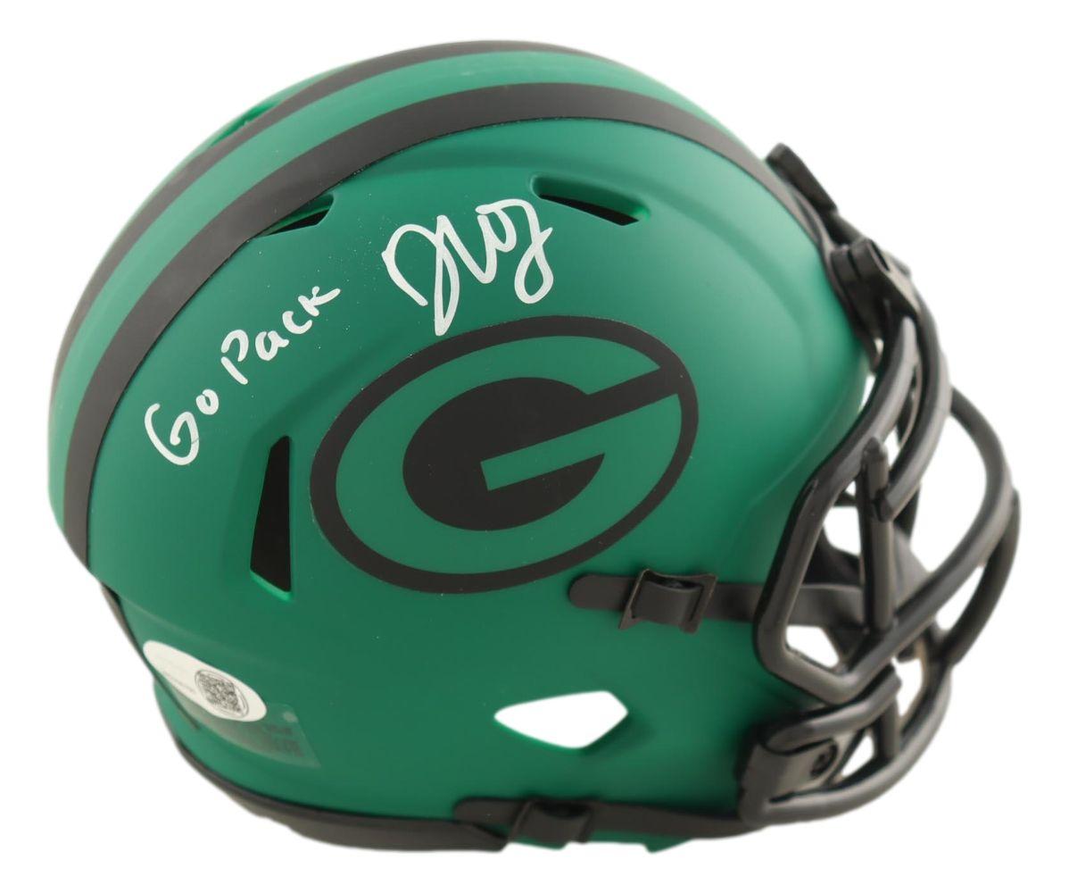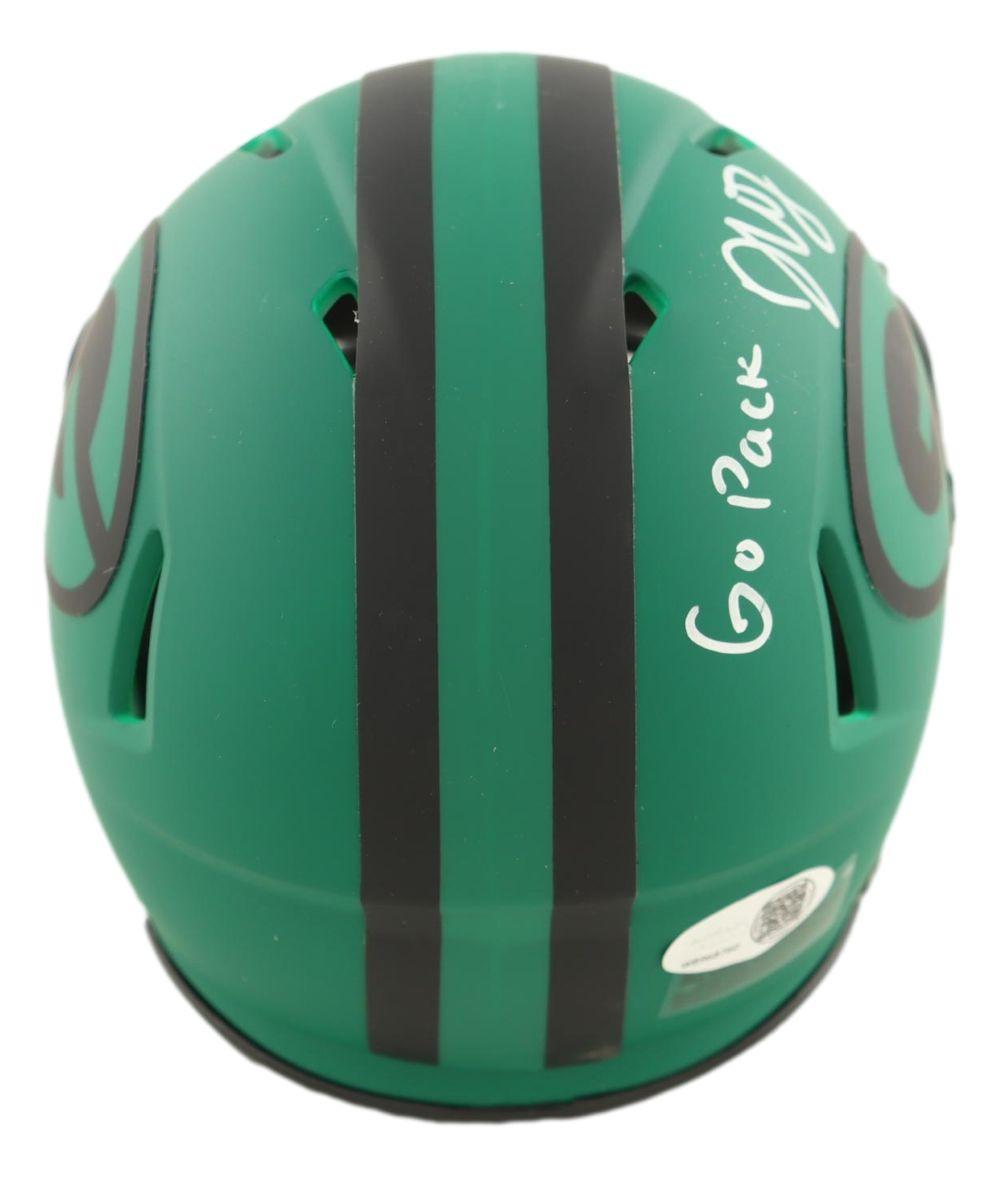 Riddell Green Bay Packers rave alternate speed mini helmet has been hand-signed and inscribed by Dontayvion Wicks.