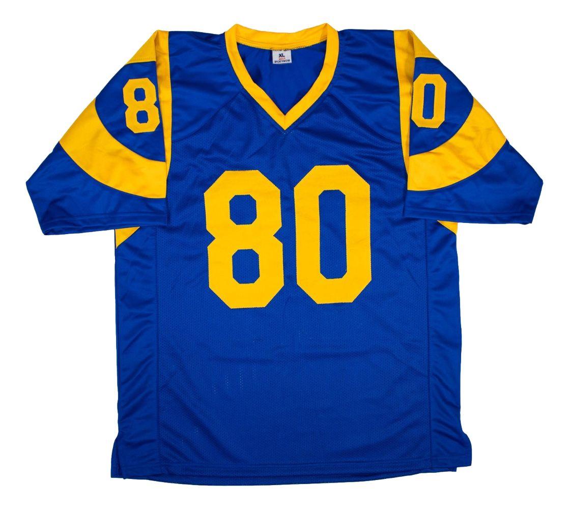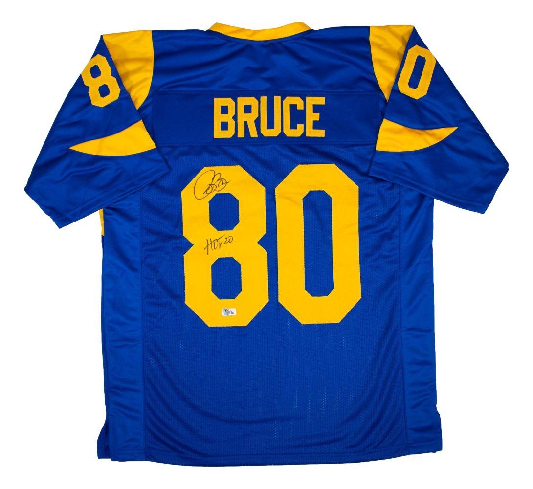 Custom jersey with everything sewn on, size XL. Hand-signed and inscribed by Isaac Bruce (HOF).