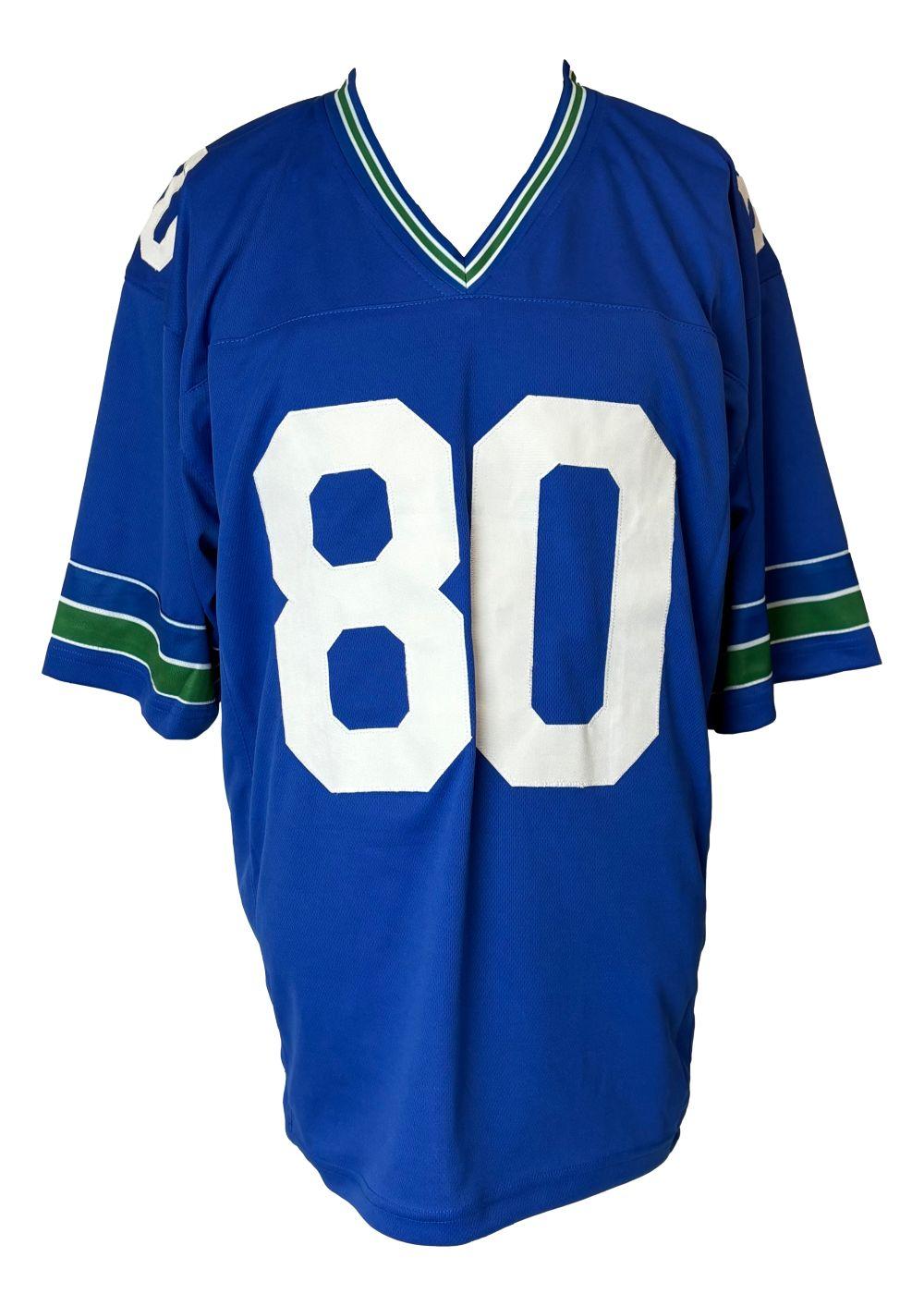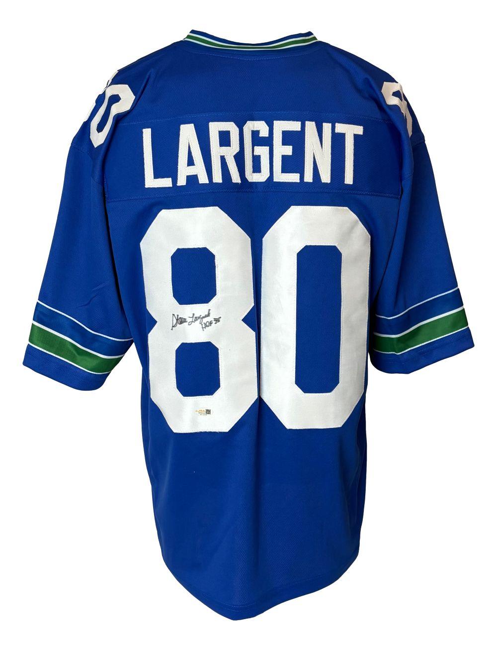 Custom jersey with everything sewn on, size XL. Hand-signed and inscribed by Steve Largent (HOF).