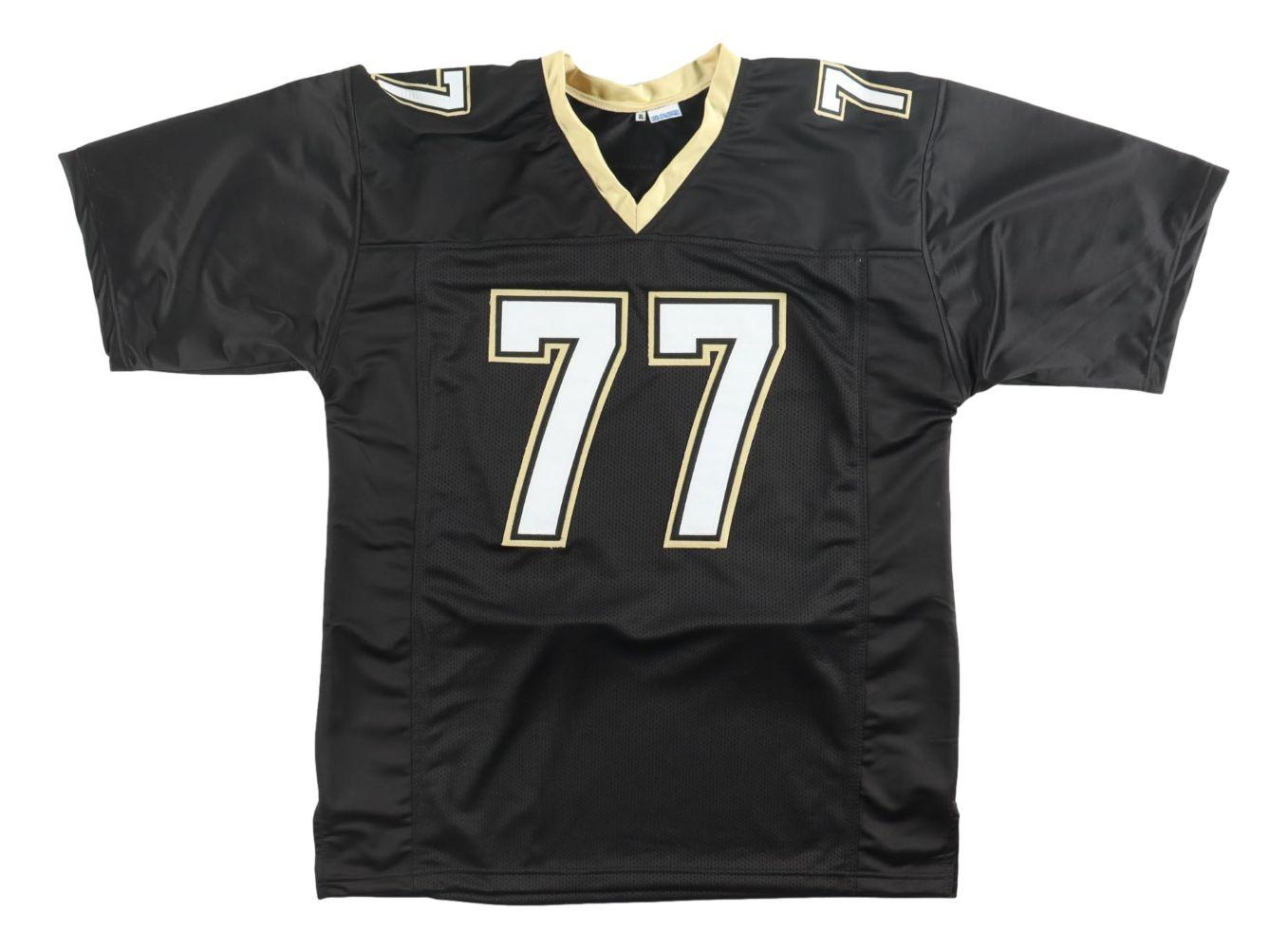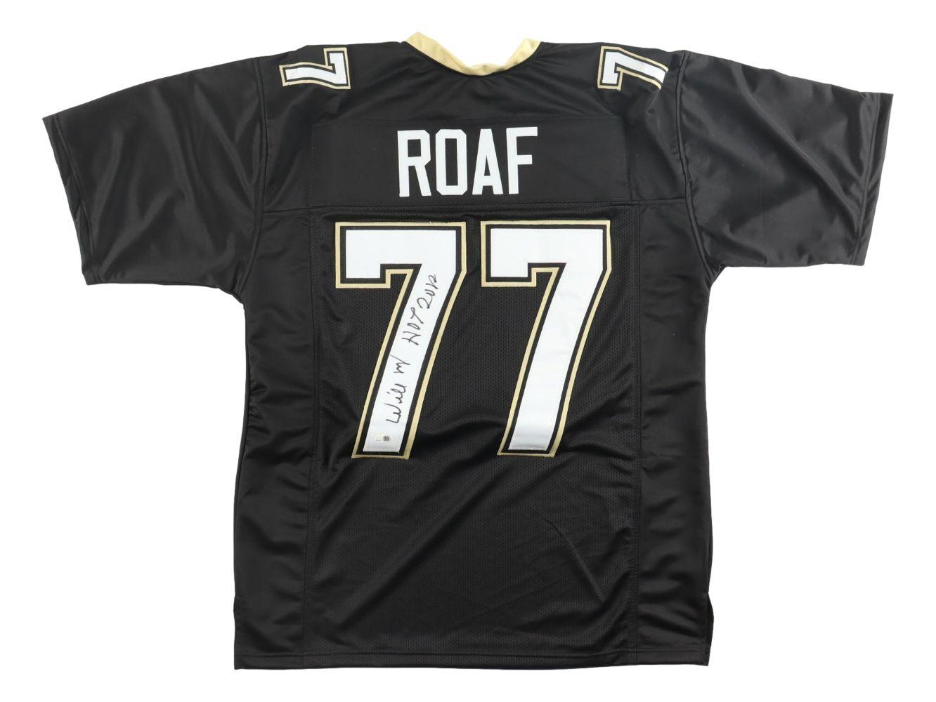 Custom jersey with everything sewn on, size XL. Hand-signed and inscribed by Willie Roaf (HOF).