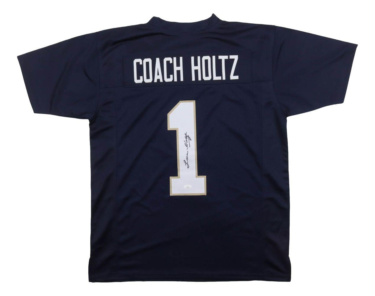 Custom jersey with everything sewn on, size XL. Hand-signed by Lou Holtz.