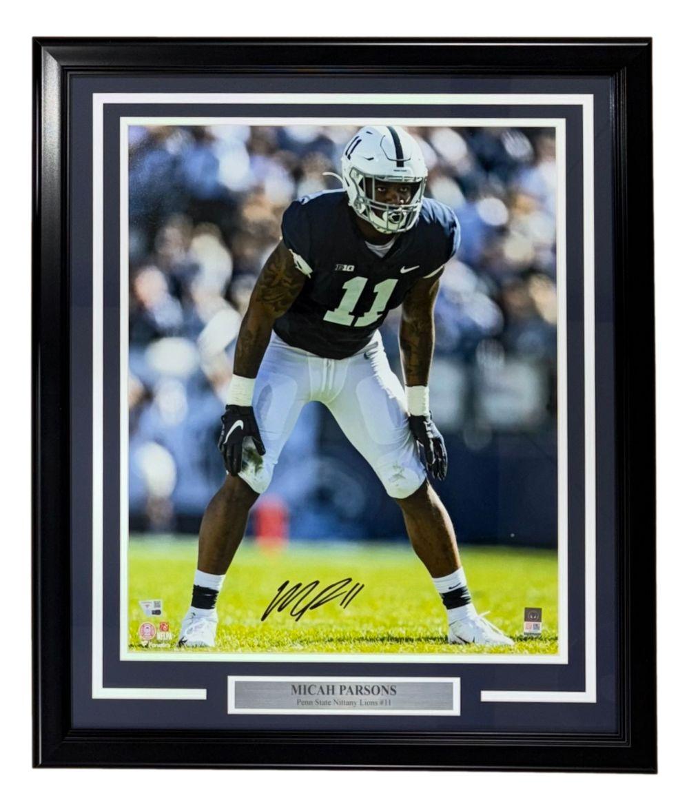 Custom frame measures 22” x 27” in size and features a photo that has been hand-signed by Micah Parsons.